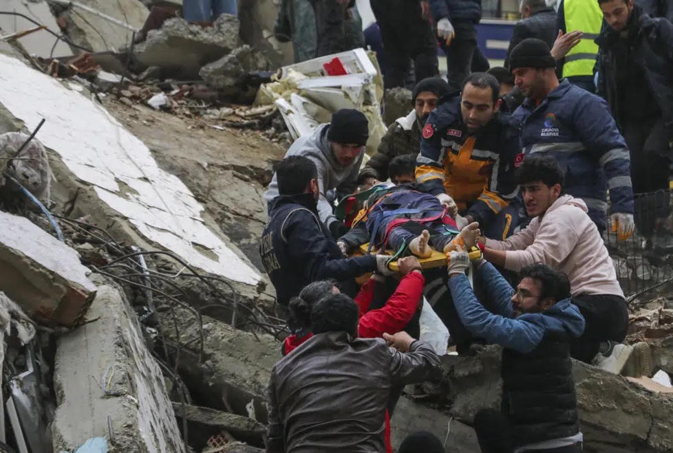 Đội cứu hộ giải cứu một người dân trong tòa nhà sụp đổ ở Adana, Thổ Nhĩ Kỳ.