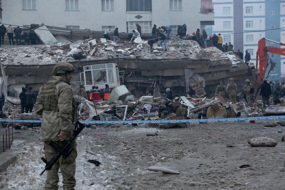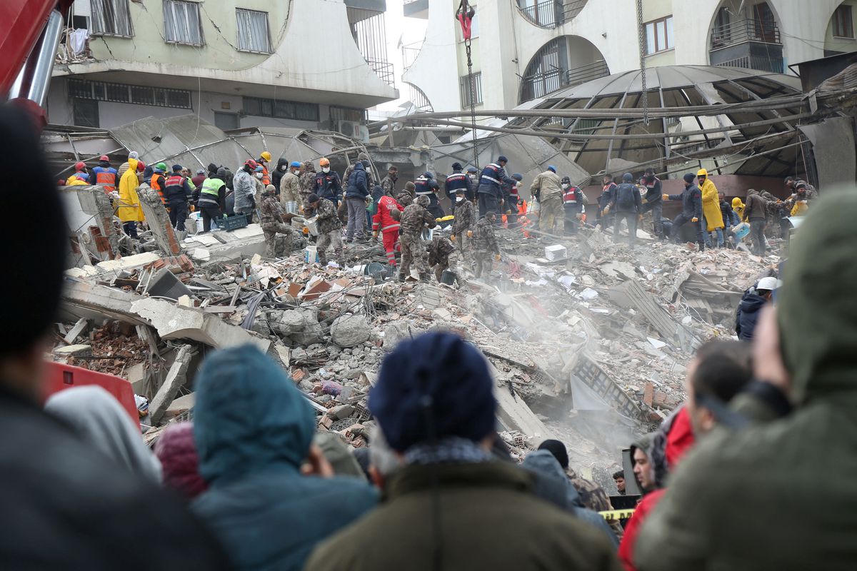 Nhân viên cứu hộ tìm kiếm những người sống sót dưới đống đổ nát của một tòa nhà bị sập ở Diyarbakir, đông nam Thổ Nhĩ Kỳ, vào ngày 6/2. Ảnh: REUTERS.