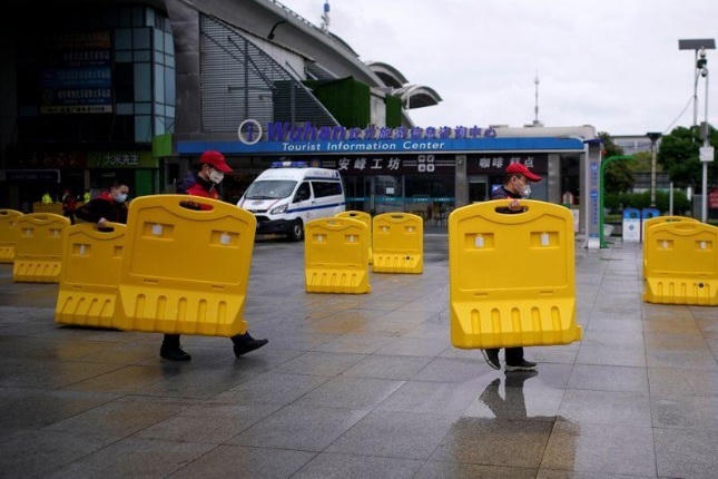 | Nhân viên an ninh dỡ bỏ rào chắn trên đường phố Vũ Hán. Ảnh: Reuters. |