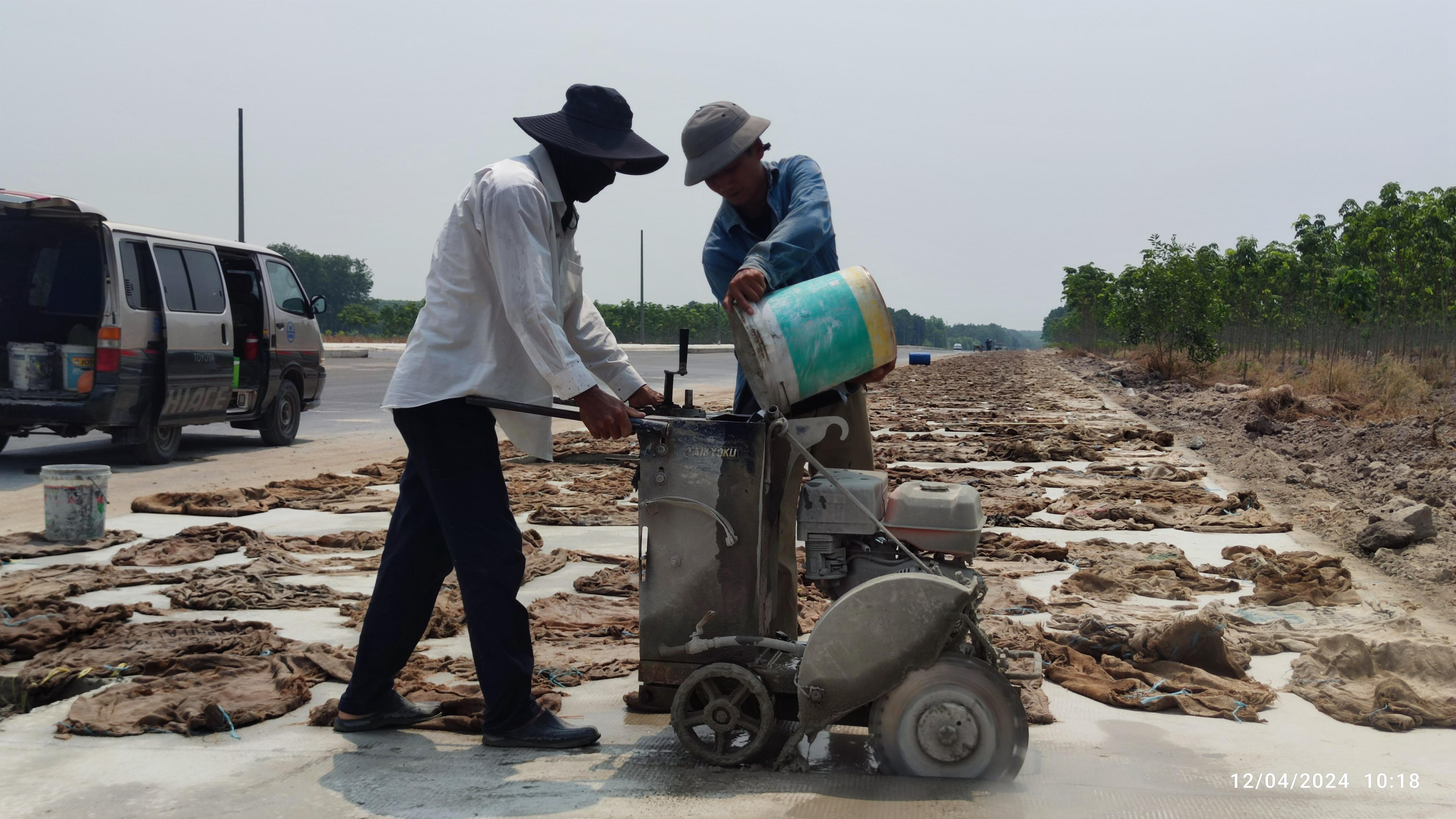 Công nhân tiến hành cắt khe co giãn bê tông giảm thiểu tình trạng nứt vỉa hè. |