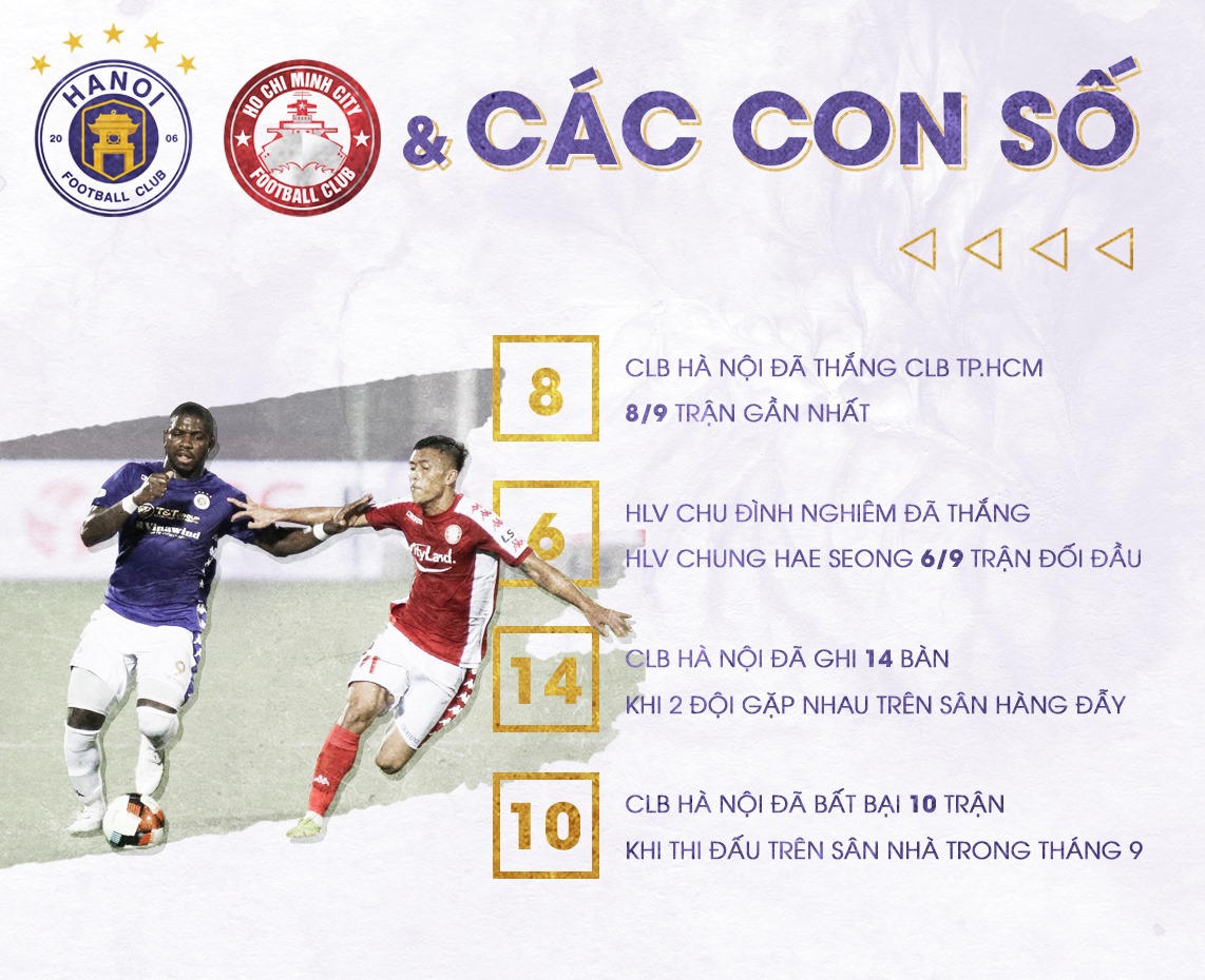CLB bóng đá Hà Nội chưa từng thất bại trước TP HCM: Trong 8 trận đấu gần nhất đối đầu với đội bóng đến từ Thành phố mang tên Bác, Văn Quyết và các đồng đội giành tới 7 chiến thắng, trận đấu còn lại kết thúc bằng tỉ số hòa 2-2.