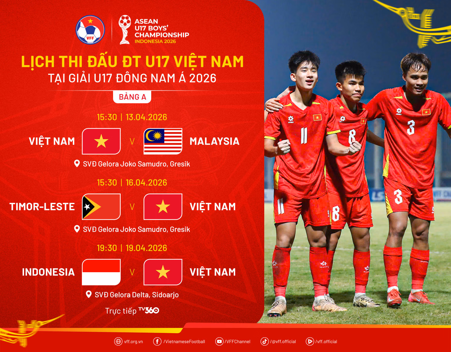 U17 Việt Nam sẽ gặp U17 Malaysia trong trận ra quân giải Đông Nam Á 2026 vào chiều 13/4.