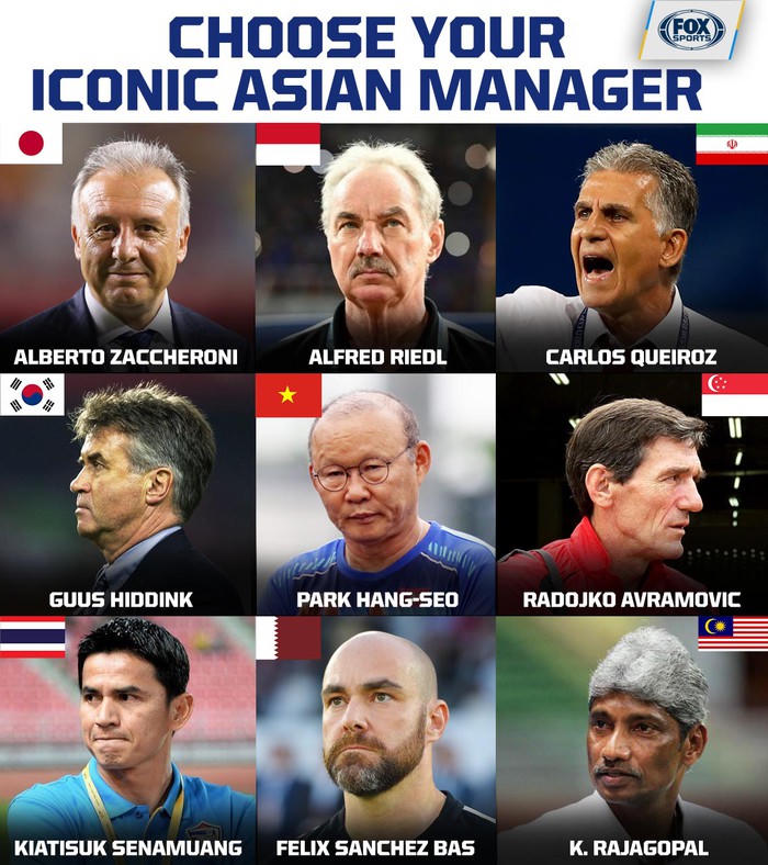 Ngoài HLV Park Hang Seo, cựu thuyền trưởng của ĐT Việt Nam là Alfred Riedl cũng có tên trong danh sách. Bên cạnh đó, còn có 7 nhà cầm quân quen mặt khác được lựa chọn gồm: Alberto Zaccheroni (cựu HLV ĐT Nhật Bản và UAE), Carlos Queiroz (cựu HLV ĐT Iran), Guus Hiddink (cựu HLV ĐT Hàn Quốc), Radojko Avramović (cựu HLV ĐT Singapore), Kiatisak (cựu HLV ĐT Thái Lan), Félix Sánchez Bas (HLV ĐT Qatar) và Rajagopal (cựu HLV ĐT Malaysia).