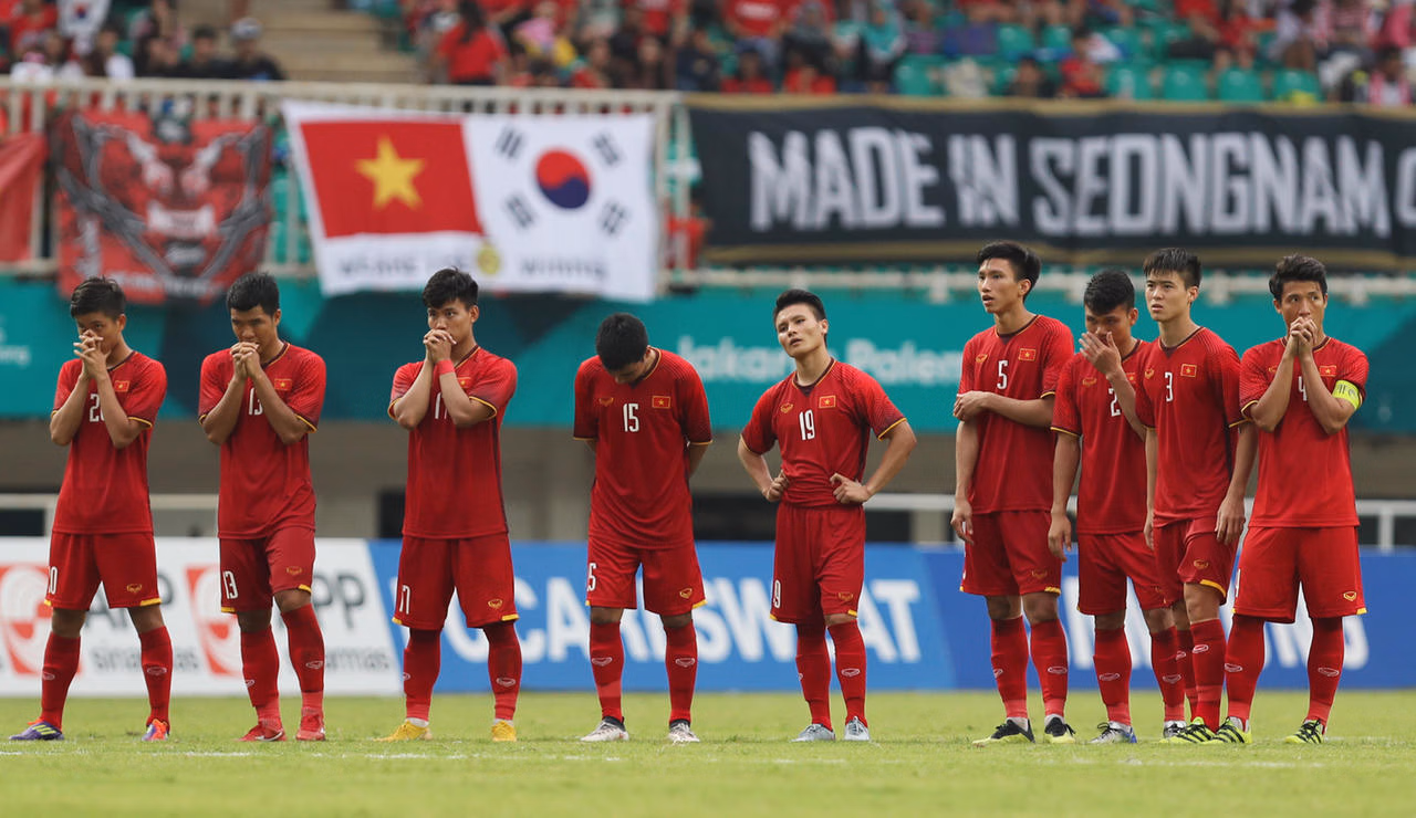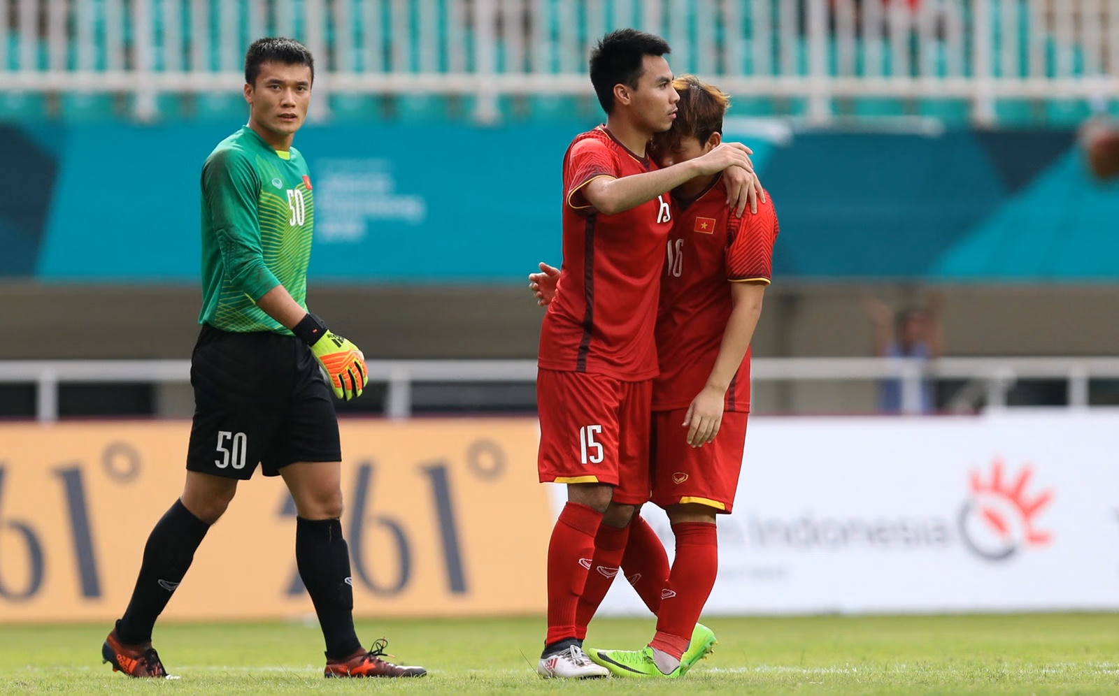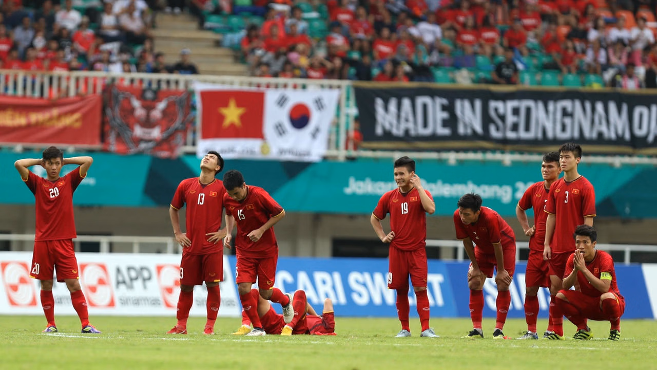 Cầu thủ Việt Nam ôm đầu tiếc nuối. Có người nằm hẳn xuống sân khi vuột huy chương Asiad trong gang tấc. Quang Hải tỏ vẻ áy náy khi anh sút hỏng quả luân lưu thứ hai, khiến Minh Vương bị áp lực trong cú sút quyết định. Người đeo băng đội trưởng Tiến Dũng trầm ngâm, có vẻ như chưa tin vào thất bại trước UAE.
