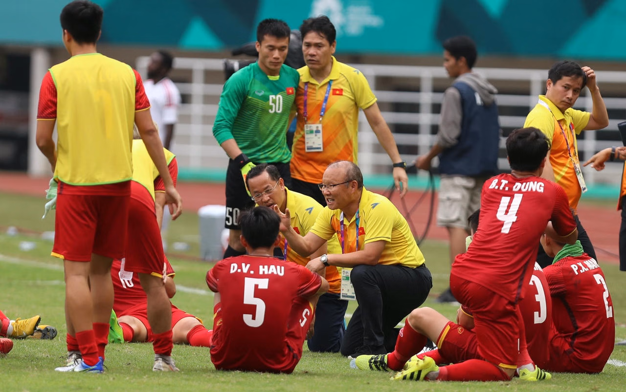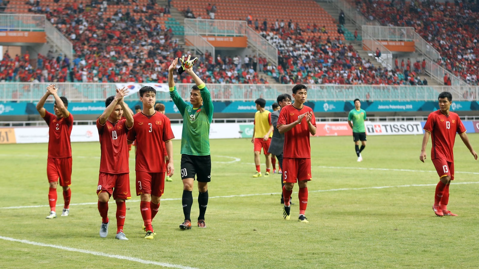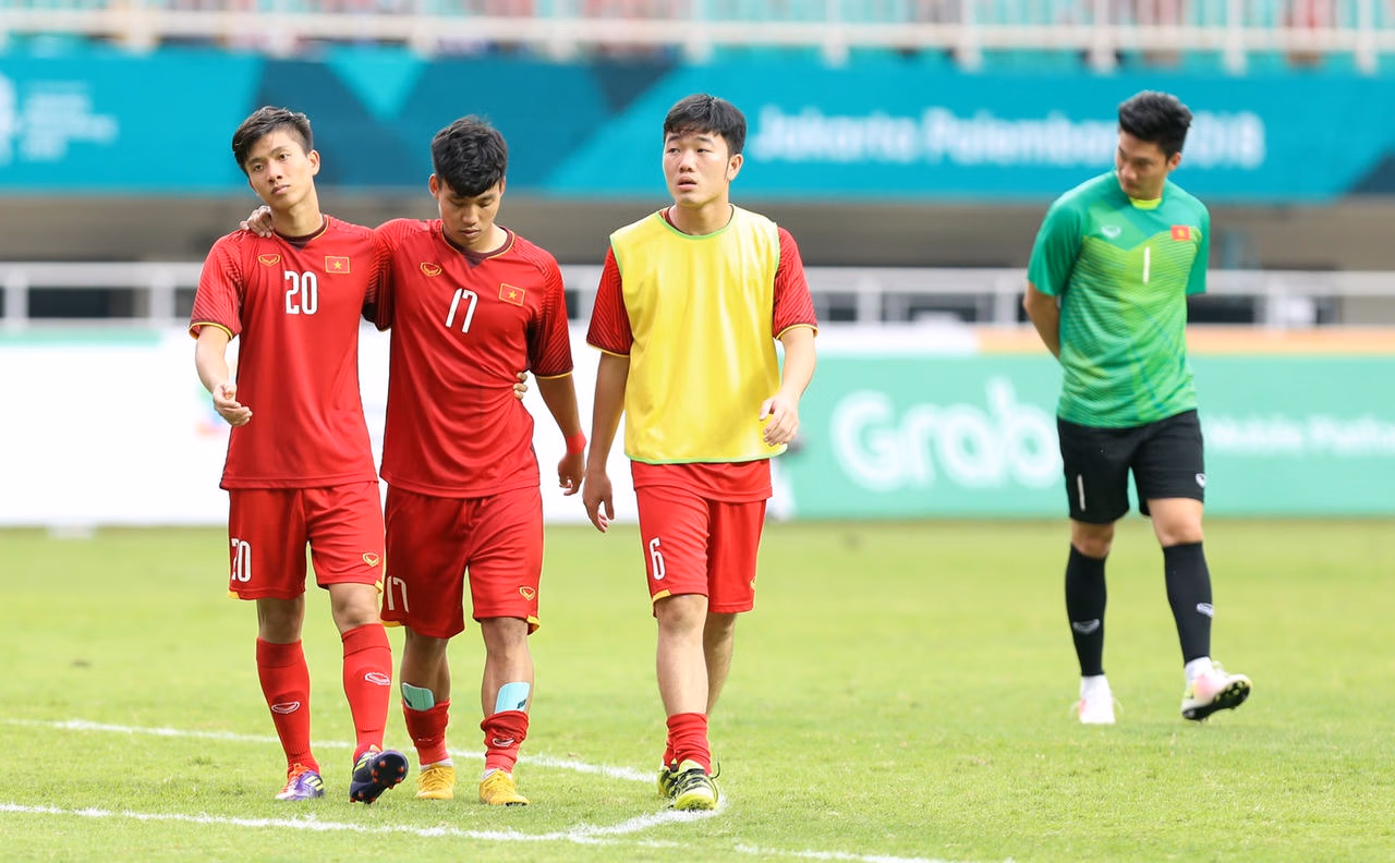 Cầu thủ Việt Nam ôm đầu tiếc nuối. Có người nằm hẳn xuống sân khi vuột huy chương Asiad trong gang tấc. Quang Hải tỏ vẻ áy náy khi anh sút hỏng quả luân lưu thứ hai, khiến Minh Vương bị áp lực trong cú sút quyết định. Người đeo băng đội trưởng Tiến Dũng trầm ngâm, có vẻ như chưa tin vào thất bại trước UAE.