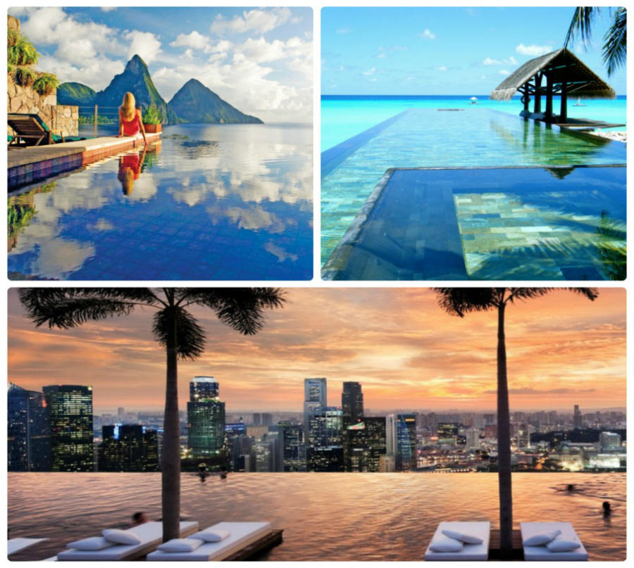 | Từ trái sang, từ trên xuống: Bể vô cực khu nghỉ dưỡng Jade Mountain (Saint Lucia); Bể thiên đường Paradise Pool (Bali, Indonesia) và Bể Skypark, Marina Bay Sands (Singapore) |