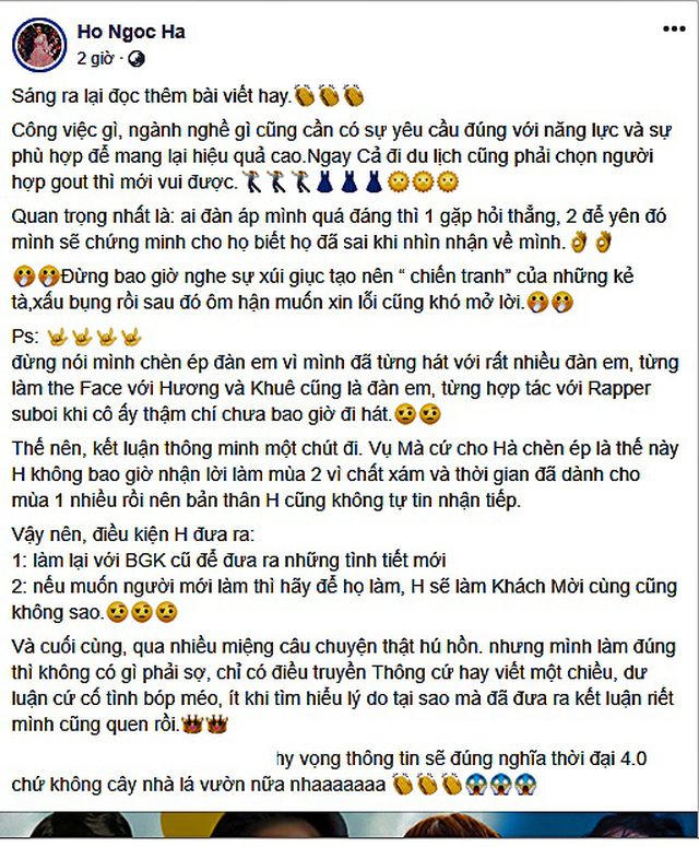 Thế nên, kết luận thông minh một chút đi. Vụ mà cứ cho Hà chèn ép là thế này, H không bao giờ nhận lời làm mùa 2 vì chất xám và thời gian đã dành cho mùa 1 nhiều rồi nên bản thân H cũng không tự tin nhận tiếp. Vậy nên, điều kiện tôi đưa ra là làm lại với ban giám khảo cũ để có những tình tiết mới. Nếu muốn người mới làm hãy để họ làm, tôi sẽ làm khách mời cùng cũng không sao. Và cuối cùng, qua nhiều miệng câu chuyện thật hú hồn nhưng mình làm đúng thì không có gì phải sợ", Hồ Ngọc Hà nhắc lại scandal bị cho rằng chèn ép đàn em.