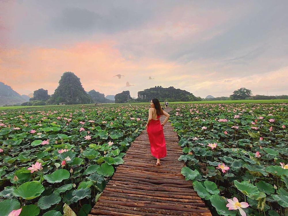 Ngoài ra, con đường gỗ nằm giữa hồ sen nở rộ với một bên là cánh đồng lúa, một bên là đỉnh hang Múa tạo nên khung cảnh lãng mạn, thơ mộng. Con đường đơn giản nhưng trải dài theo hình trái tim giữa hồ sen thực sự chinh phục bất cứ du khách nào.