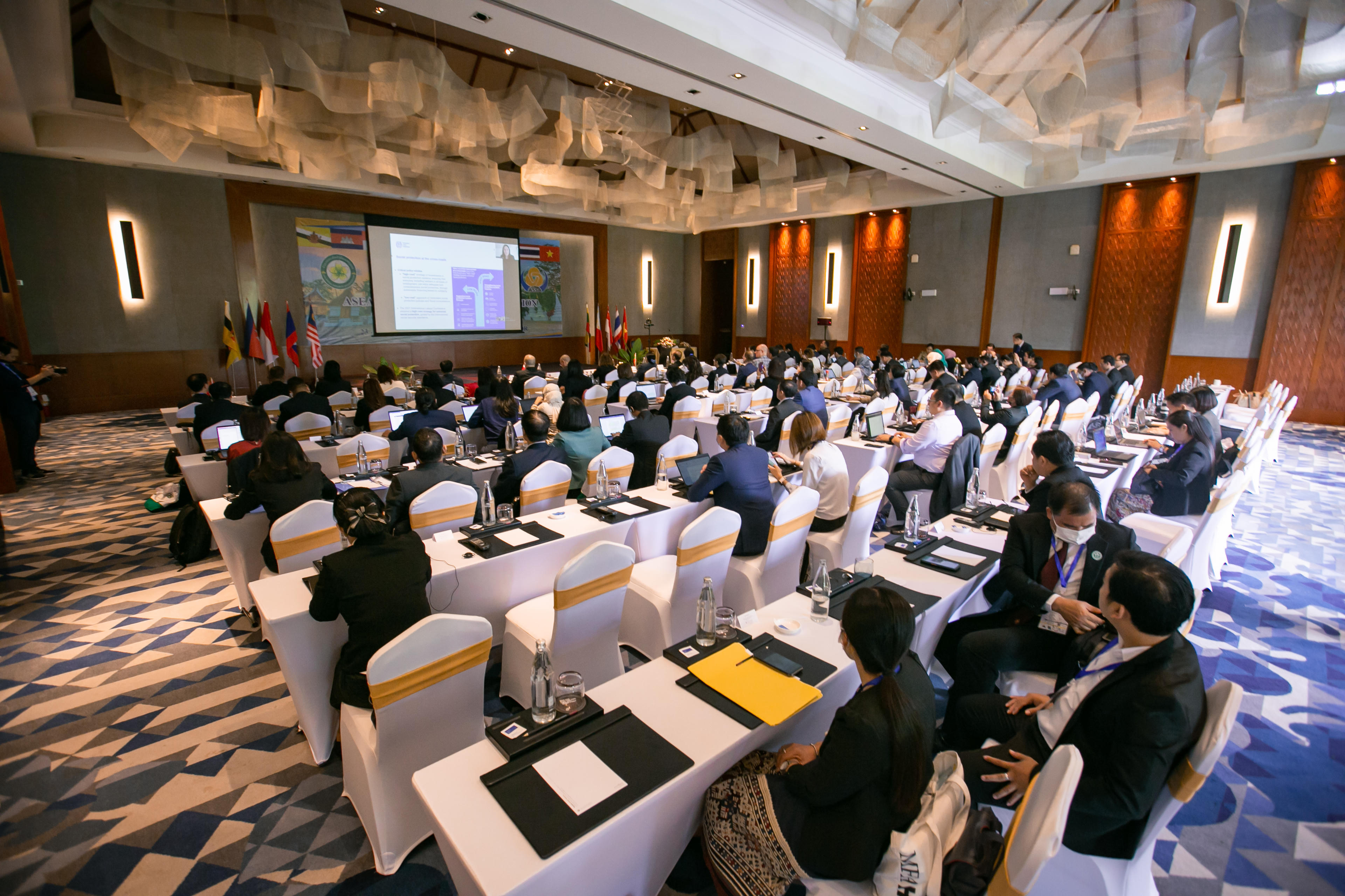 Trong phiên đầu tiên của Hội thảo, các đại biểu đã được lắng nghe tham luận của các chuyên gia quốc tế gồm: Bảo trợ xã hội bền vững vì một thế giới sau đại dịch lấy con người làm trung tâm; Hướng tới hiện thực hóa quyền phổ cập về an sinh xã hội và việc làm bền vững cho tất cả mọi người; Tài trợ phi tập trung và quan hệ đối tác cho phát triển nông thôn – Nghiên cứu trường hợp từ Cộng hòa dân chủ nhân dân Lào; Tài chính bền vững và quản lý tài chính công được cải thiện để đảm bảo an sinh xã hội toàn cầu và đầy đủ; Thực hành tốt trong việc thúc đẩy khả năng tiếp cận SSF của NLĐ phi chính thức.