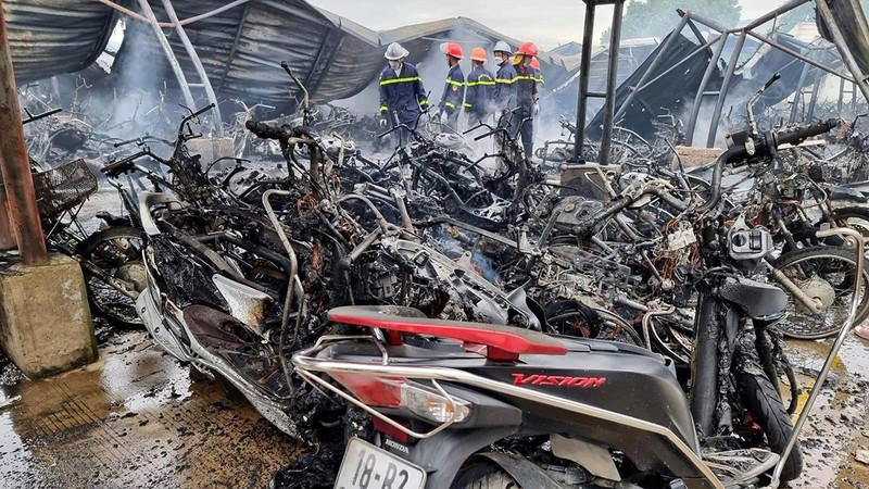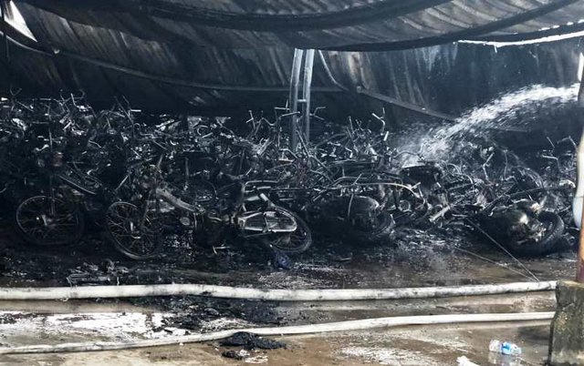 Hàng trăm xe máy bị ngọn lửa thiêu rụi chỉ còn trơ khung sắt. |