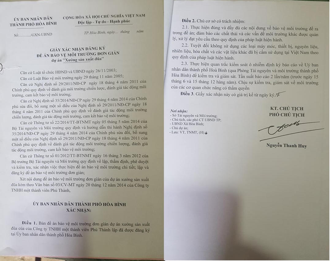 Sau khi nhận được giấy xác nhận đăng ký đề án bảo vệ môi trường đơn giản của mình, ông Thịnh đã kiểm tra văn bản trên và được biết đề án trên đã được đồng chí Nguyễn Thanh Huy, Phó Chủ tịch UBND Thành phố Hòa Bình ký xác nhận từ tháng 12 năm 2014, chỉ chờ đóng dấu và lấy số văn bản là có thể trả hồ sơ cho người dân.
