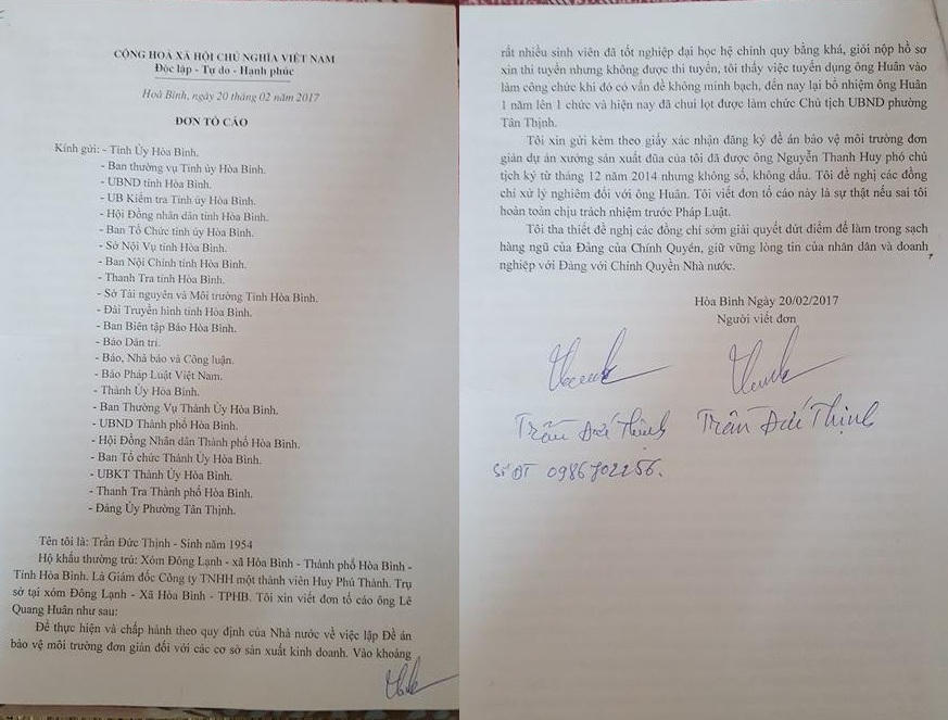 Nội dung đơn nêu rõ, vào khoảng tháng 8 năm 2014, ông Trần Đức Thịnh có lập đề án bảo vệ môi trường đơn giản cho Công ty TNHH một thành viên Huy Phú Thành, trụ sở tại xóm Đông Lạnh xã Hòa Bình,Ttành phố Hòa Bình,tỉnh Hòa Bình. Ngành nghề kinh doanh của công ty là sản xuất đũa tre, quy mô sản xuất nhỏ, chỉ có một xưởng sản xuất tại Trụ sở Công ty.