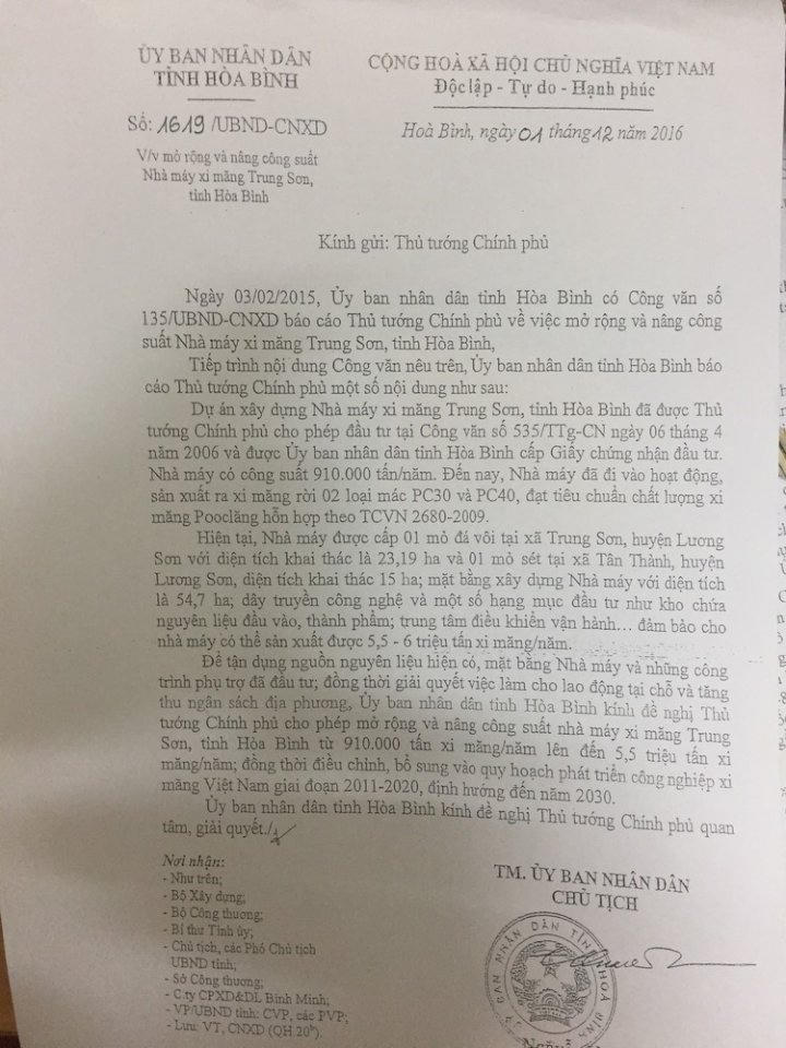 Cụ thể, nhà máy xi măng Trung Sơn thuộc Công ty Cổ phần Tập đoàn xây dựng và du lịch Bình Minh (Công ty Bình Minh) nằm tại xã Trung Sơn, huyện Lương Sơn, tỉnh Hòa Bình, được Thủ tướng Chính phủ phê duyệt quy hoạch vùng nguyên liệu sản xuất xi măng đến năm 2020, tại Quyết định số 1065/QĐ-TTg ngày 9/7/2010.