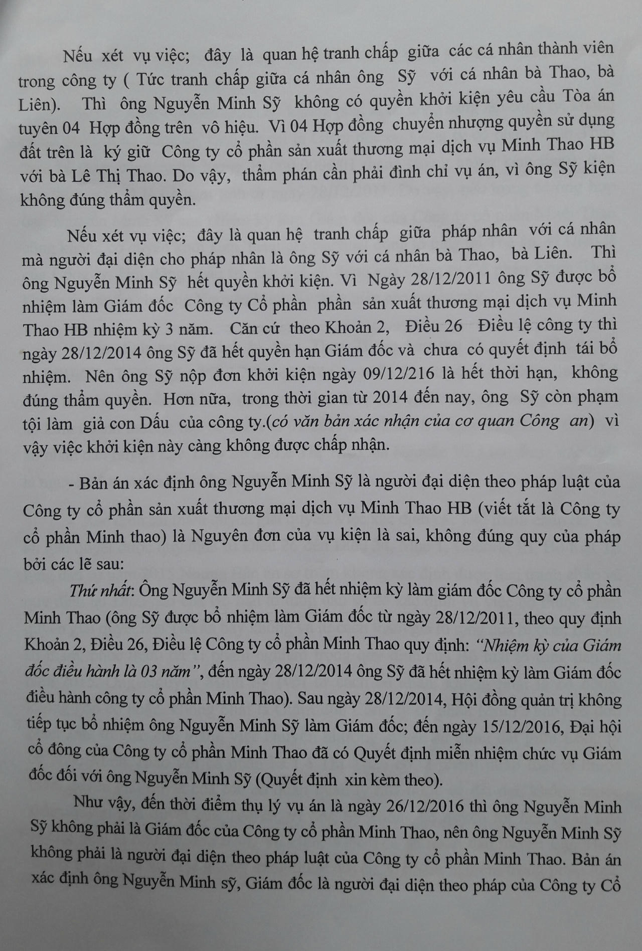 “Việc TAND huyện Lạc Thủy xác định sai thẩm quyền, giải quyết vụ việc kéo dài nhiều tháng đã làm ảnh hưởng đến hoạt động của công ty và các bị đơn là bà Lê Thị Thao và Nguyễn Vũ Liên. Đề nghị TAND cấp cao xem xét trách nhiệm bồi thường thiệt hại cho Công ty Minh Thao và các bị đơn...Toàn bộ phần nhận định, đánh giá và xác định 4 hợp đồng vô hiệu không có cơ sở pháp lý, áp dụng sai quy định pháp luật về thời hiệu”, đơn đề nghị giám đốc thẩm của bà Lê Thị Thao viết.