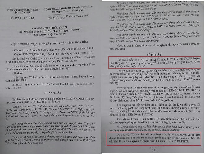 Tuy nhiên, chưa đầy 1 tháng sau, Viện KSND tỉnh Hòa Bình có kháng nghị phúc thẩm đối với bản án số 01/2017/KDTM-ST của TAND huyện Lạc Thủy. Văn bản số 02/2017/KNPT-DS ngày 7/8/2017 nêu rõ: “Bản án sơ thẩm....đã có vi phạm nghiêm trọng về tố tụng khi thụ lý và giải quyết vụ án không thuộc thẩm quyền”.
