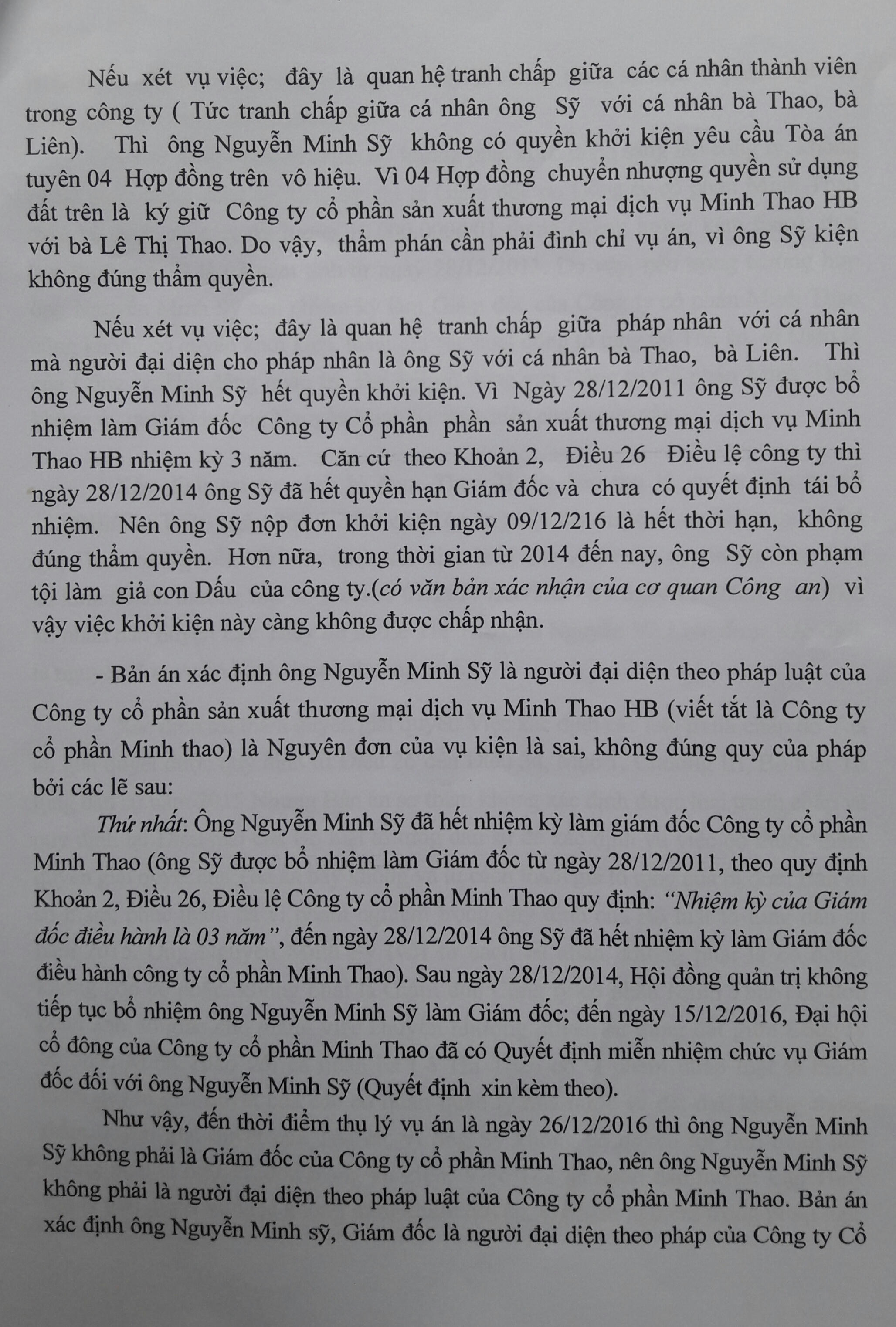 Ngày 15/12/2016, Đại hội cổ đông của Công ty cổ phần Minh Thao đã có quyết định miễn nhiệm chức vụ Giám đốc đối với ông Nguyễn Minh Sỹ. Như vậy, tại thời điểm thụ lý vụ án của Tòa án nhân dân huyện Lạc Thủy, tức ngày 26/12/2016, ông Nguyễn Minh Sỹ không còn là Giám đốc của công ty, nên không phải là người đại diện theo pháp luật của công ty.