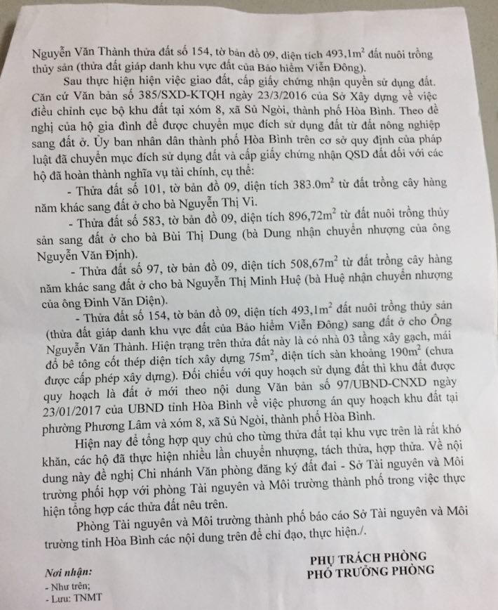 Đối với Sở TNMT, tỉnh Hòa Bình phải chỉ đạo Văn phòng Đăng ký đất đai không thực hiện các thủ tục chuyển quyền sử dụng đất cho các trường hợp được cấp giấy chứng nhận quyền sử dụng đất tại khu đất nêu trên.