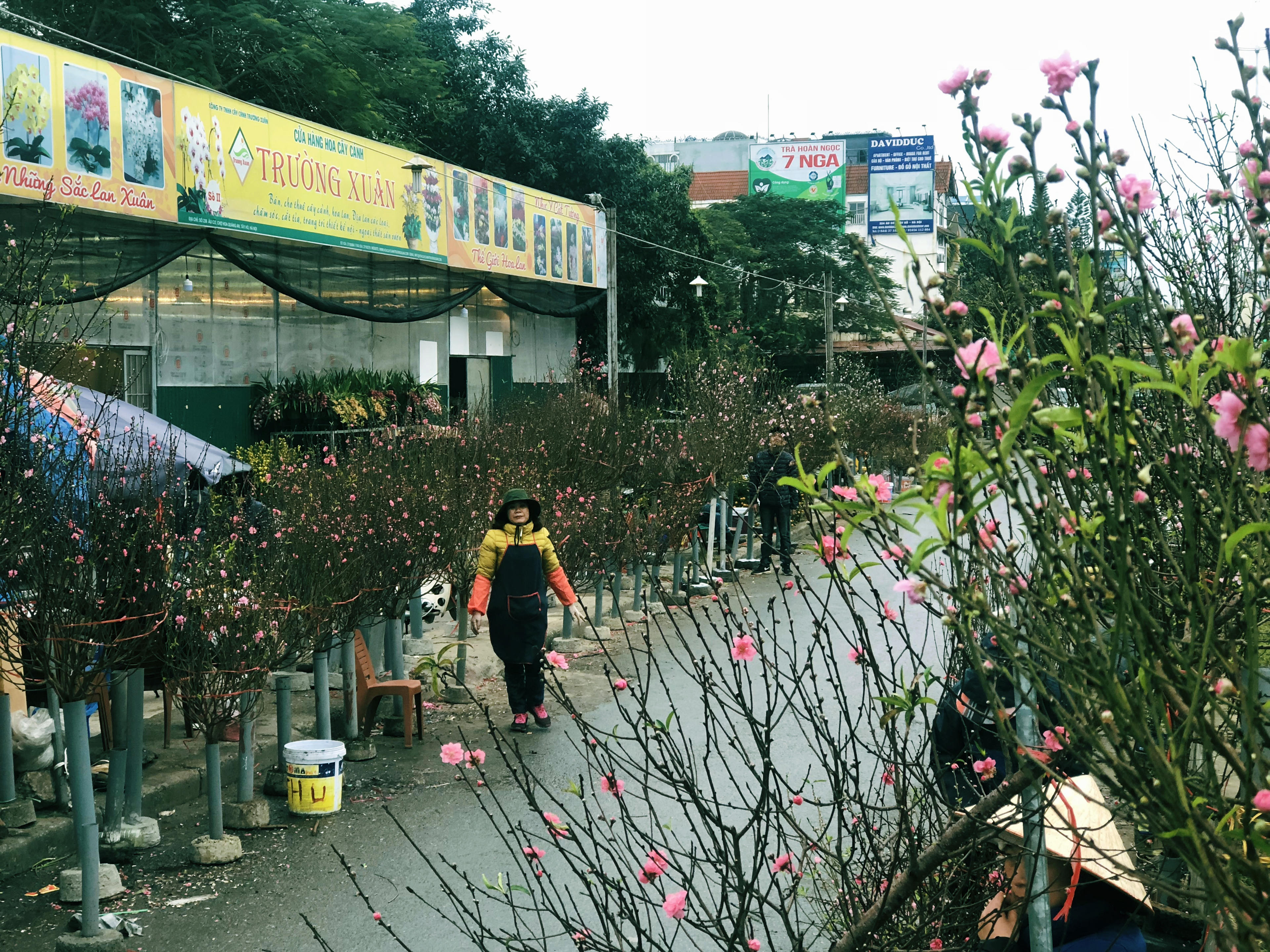 Nếu muốn cảm nhận không khí mùa xuân về trên đất Thủ đô, bạn có thể đến thăm chợ hoa Quảng An ở phường Quảng An, quận Tây Hồ, Hà Nội. Tại đây, các tiểu thương đã bắt đầu trưng bày và buôn bán những cây đào, cành đào hồng thắm phục vụ cho người chơi trước Tết Âm lịch.