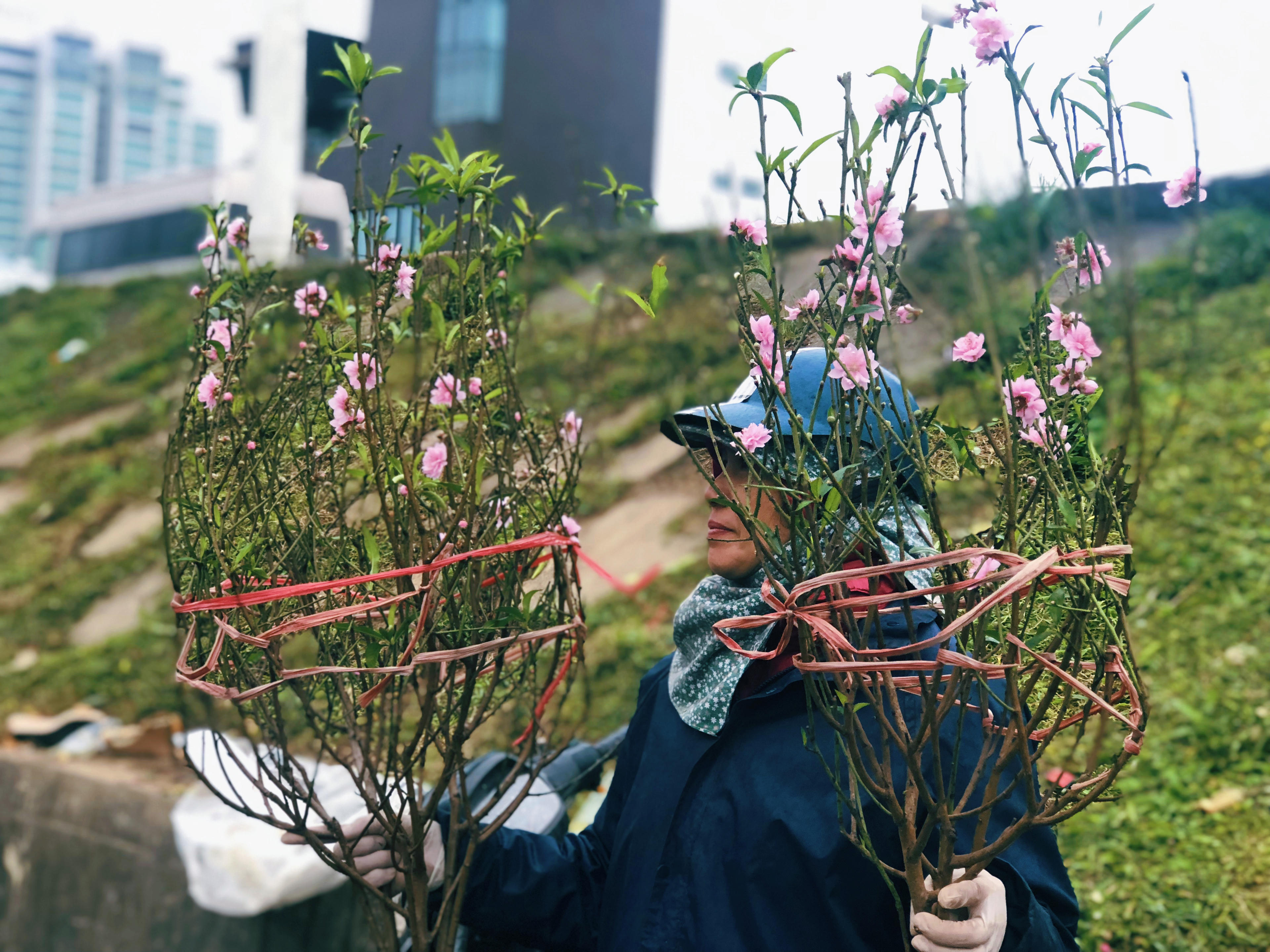 Người xa quê khi trở về cũng mang theo một cành đào như để mang về quê nhà một chút không khí của mùa xuân Hà Nội.