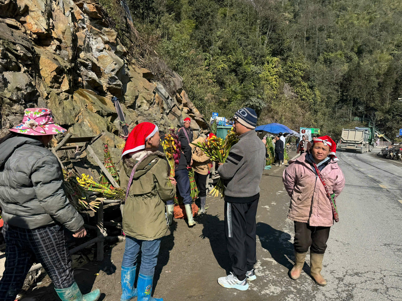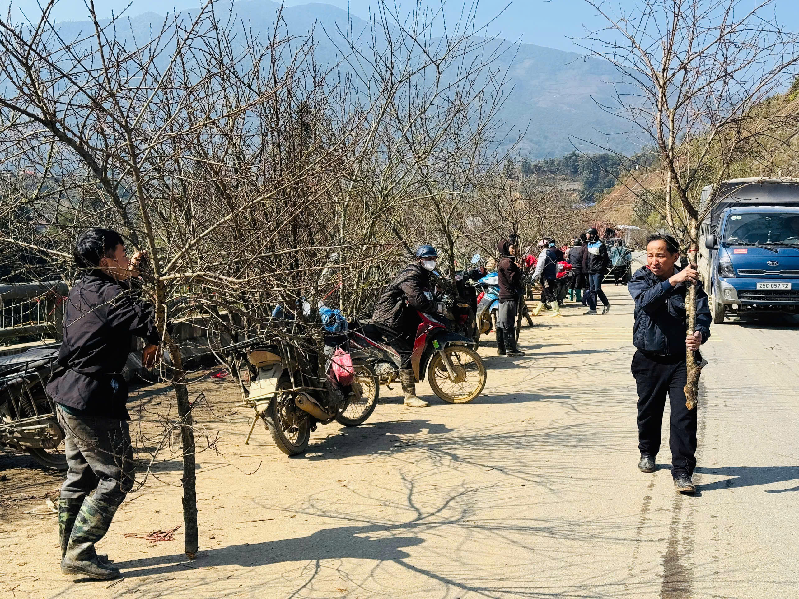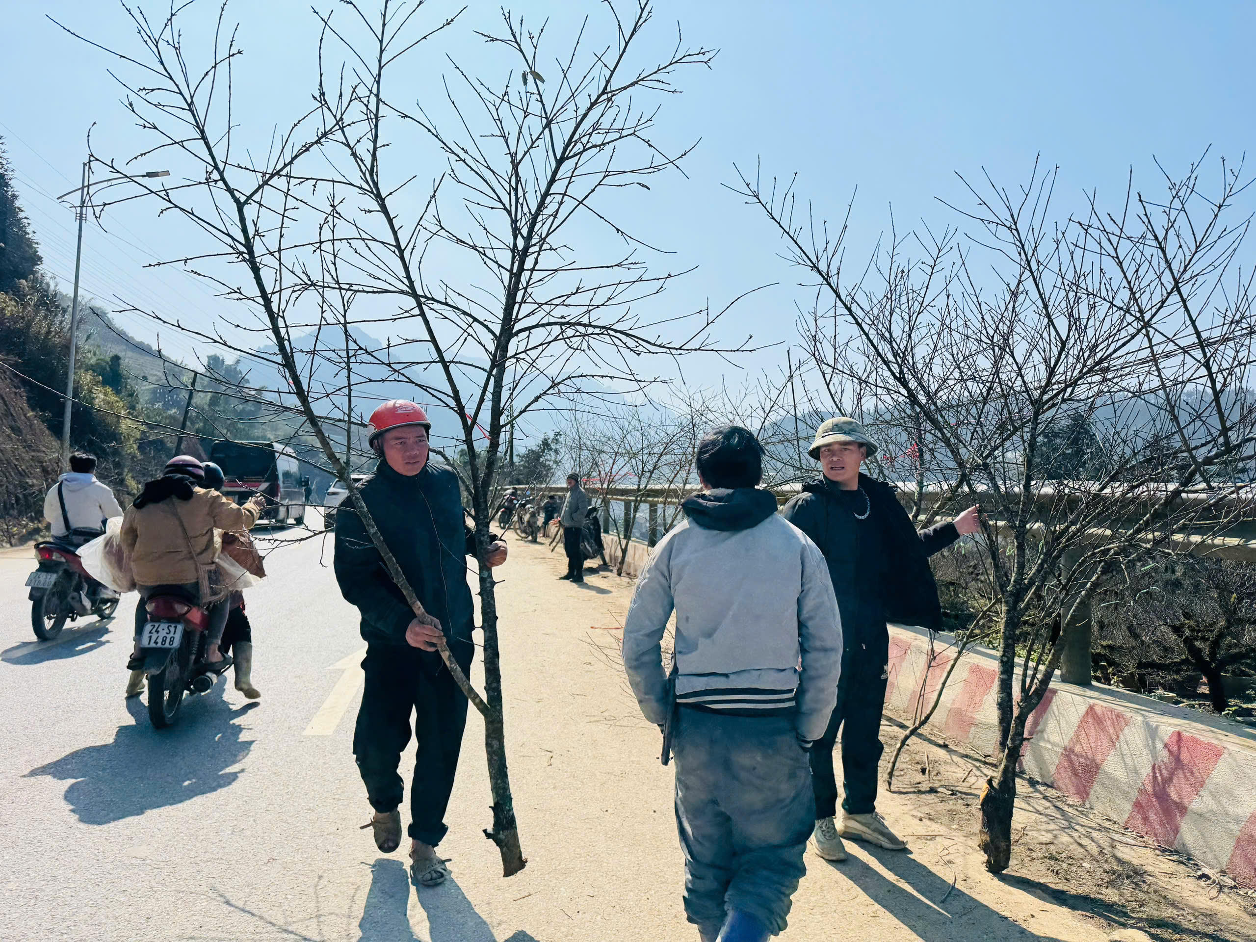 Nhiều hộ dân không có phương tiện đi lại thì vác đào đi bộ từ bản xuống đường.