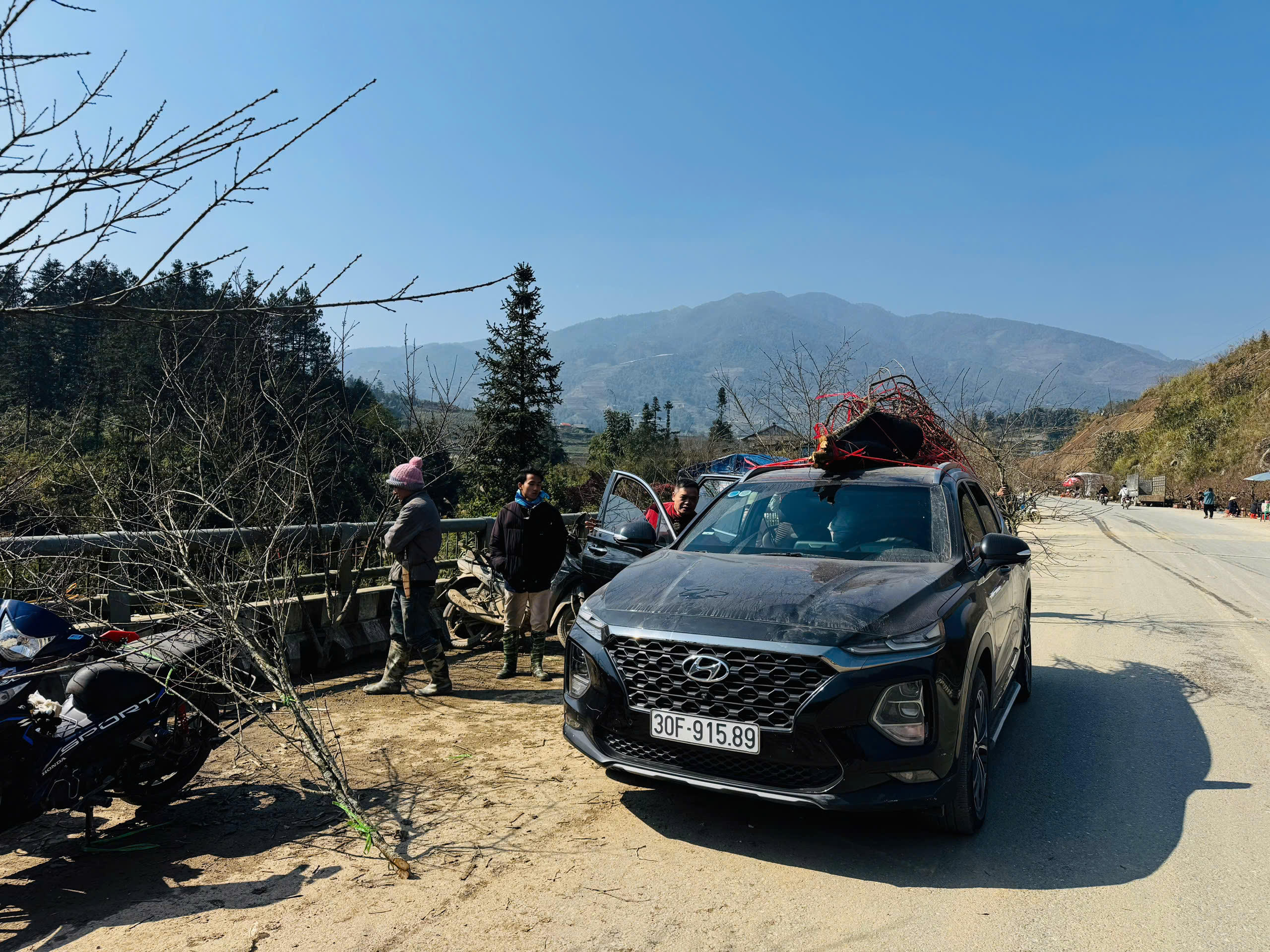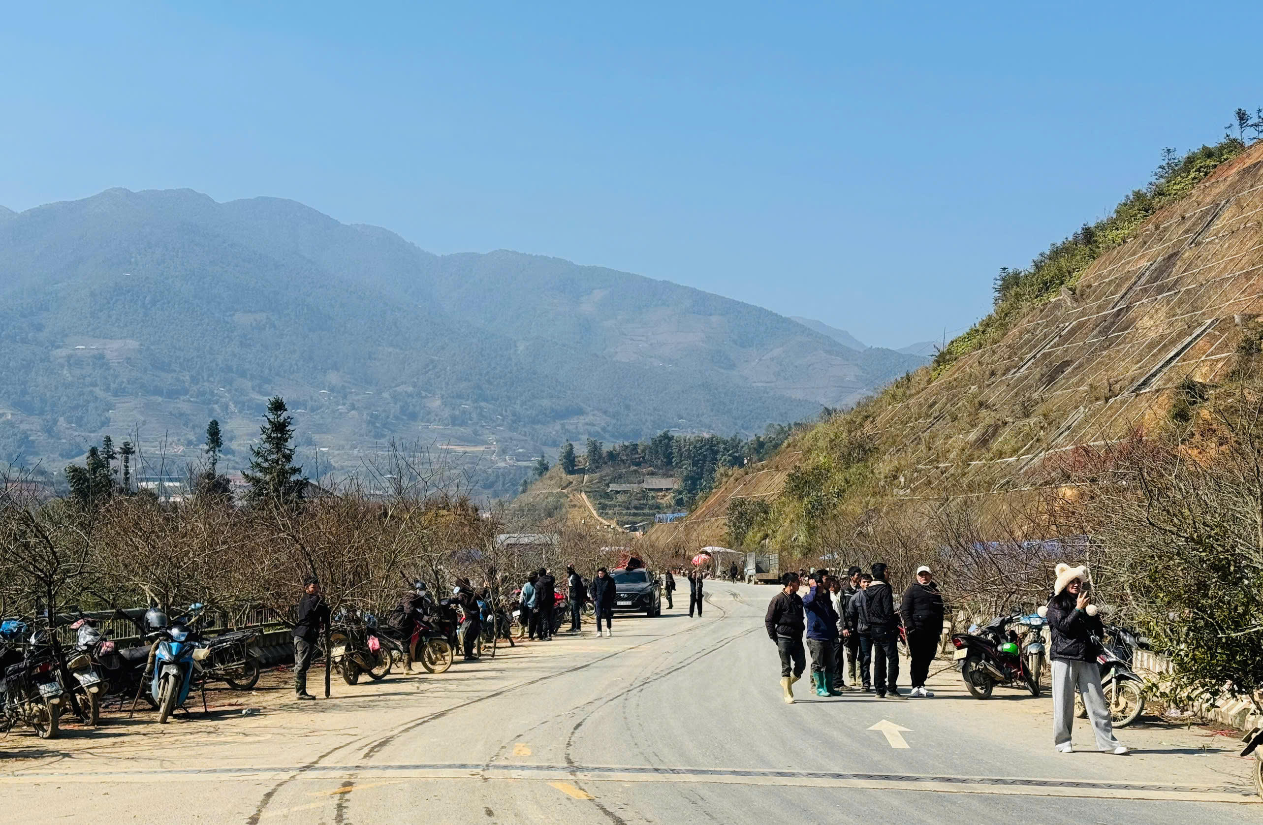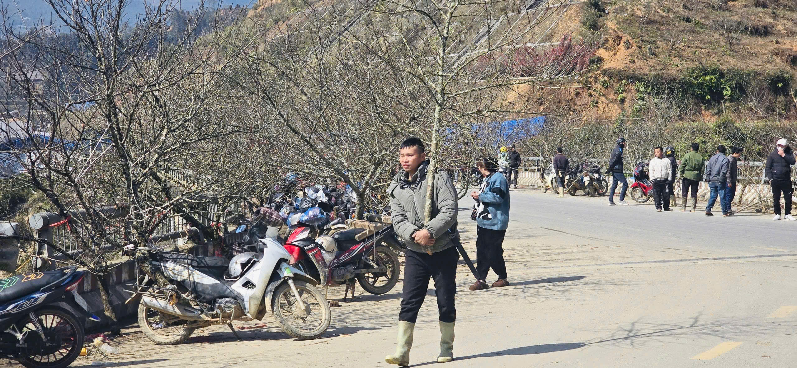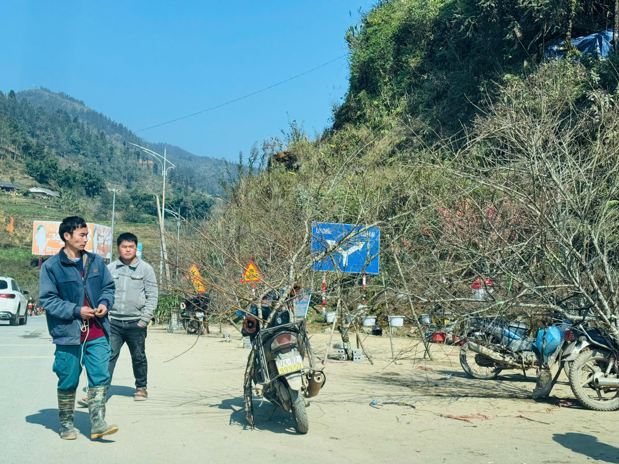 Nhiều hộ dân không có phương tiện đi lại thì vác đào đi bộ từ bản xuống đường.