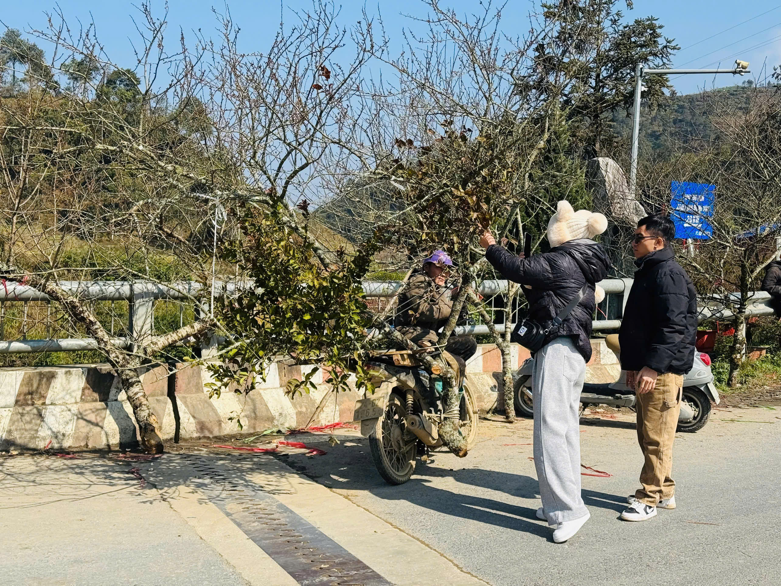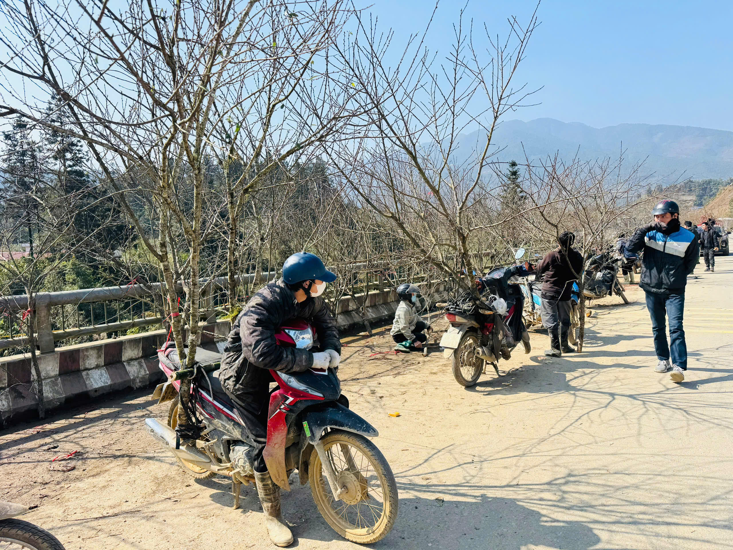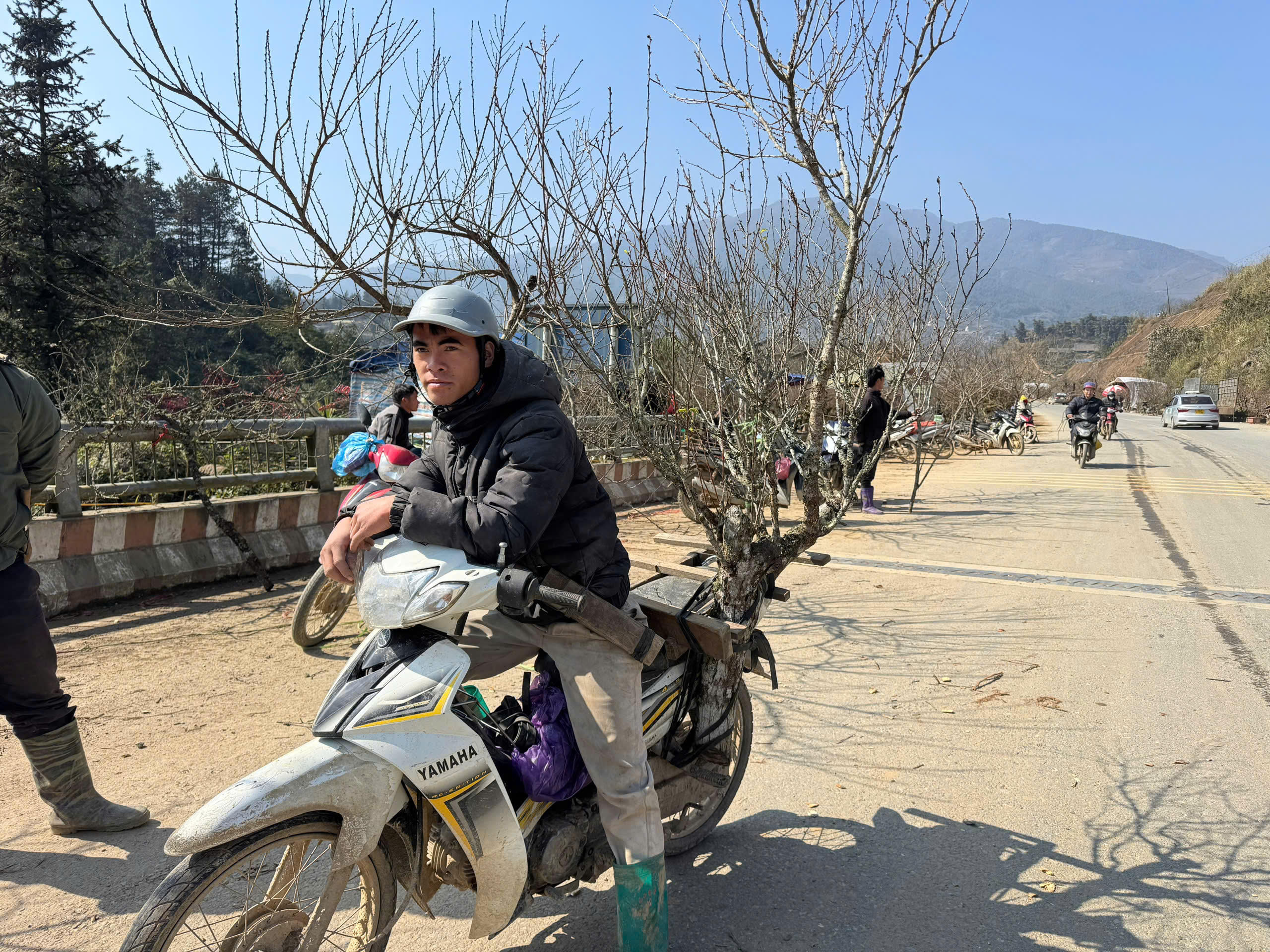 Để thuận lợi cho việc vận chuyển, người dân thường dùng xe máy để chở đào đi bán.