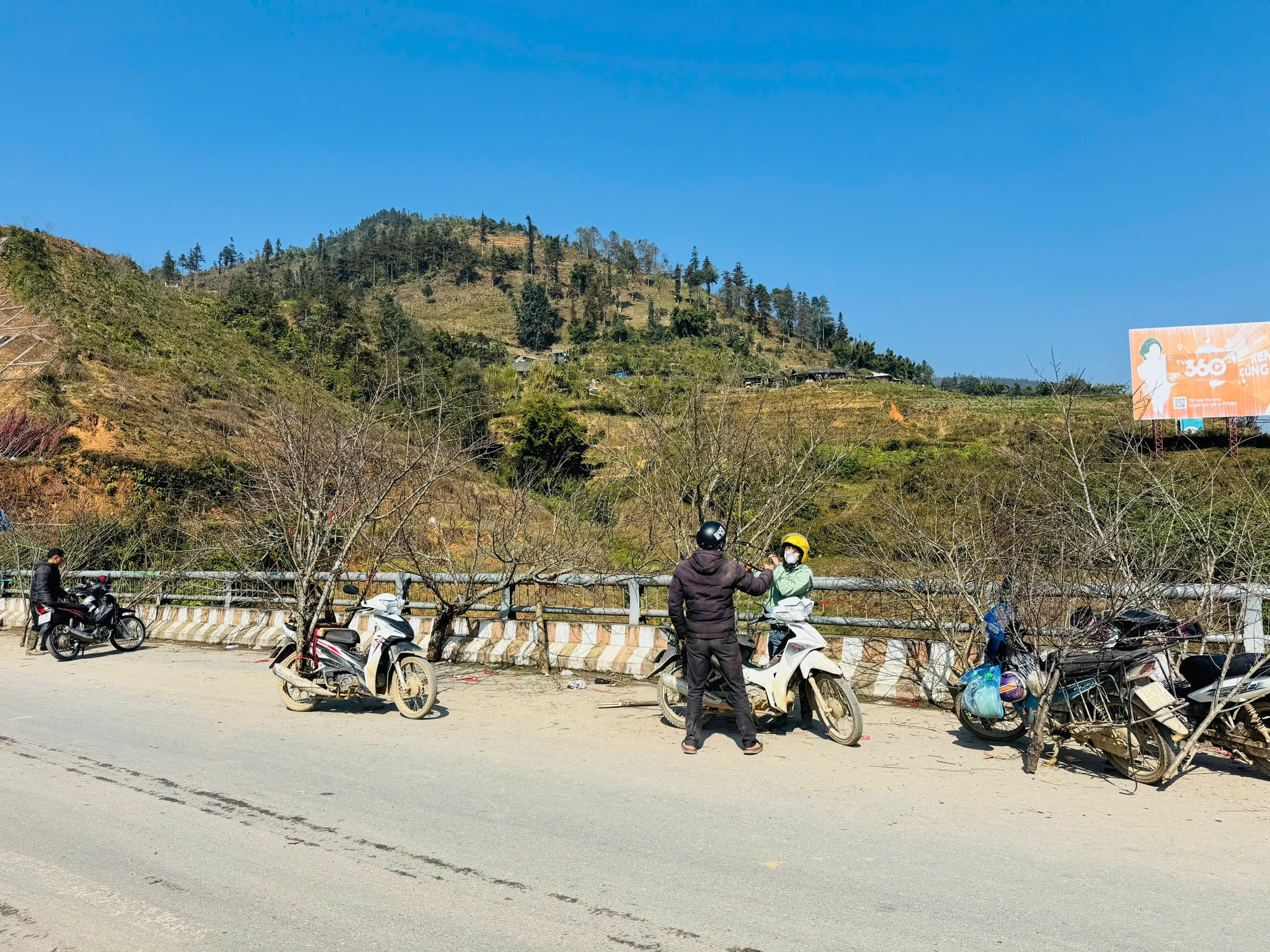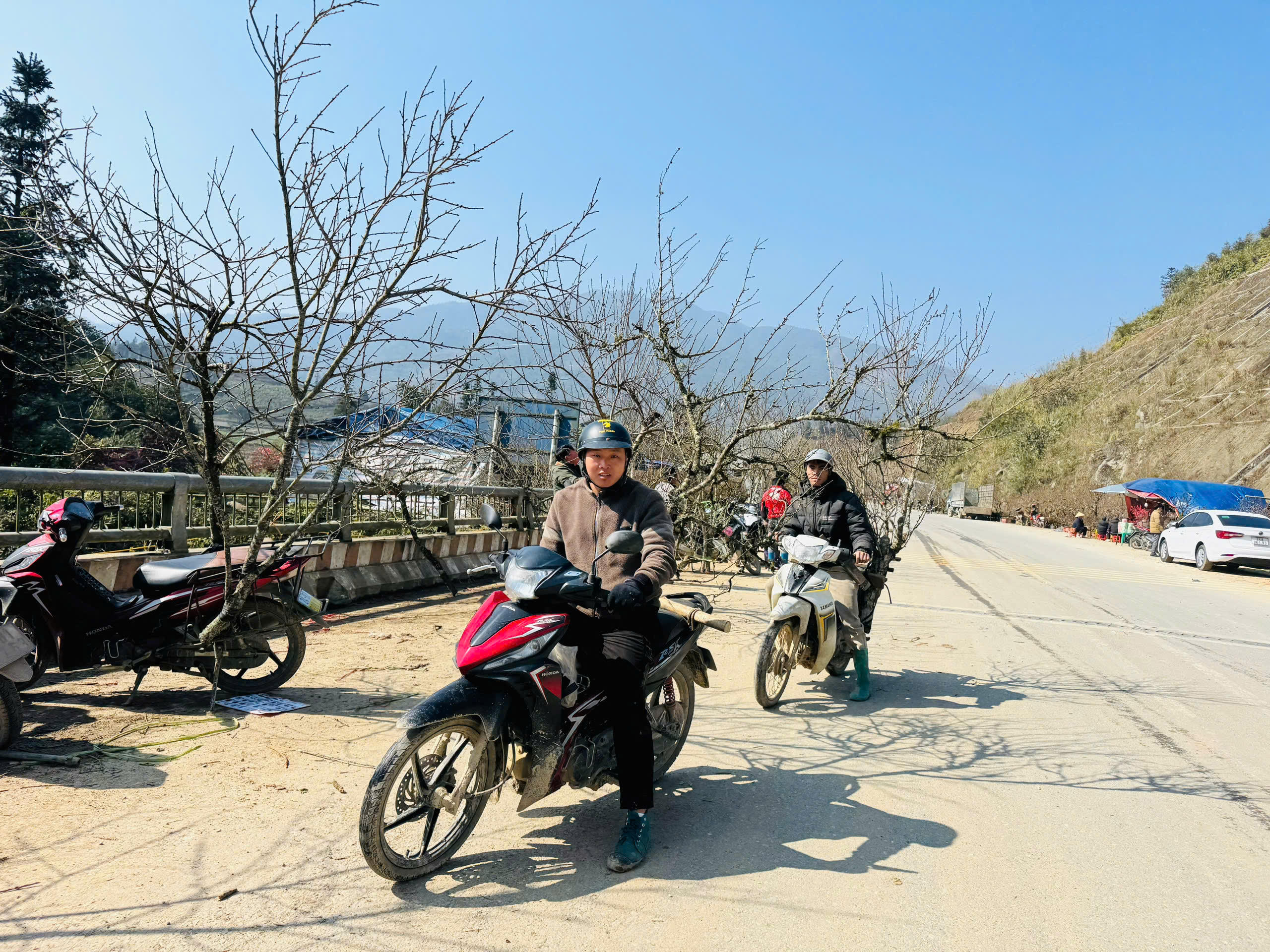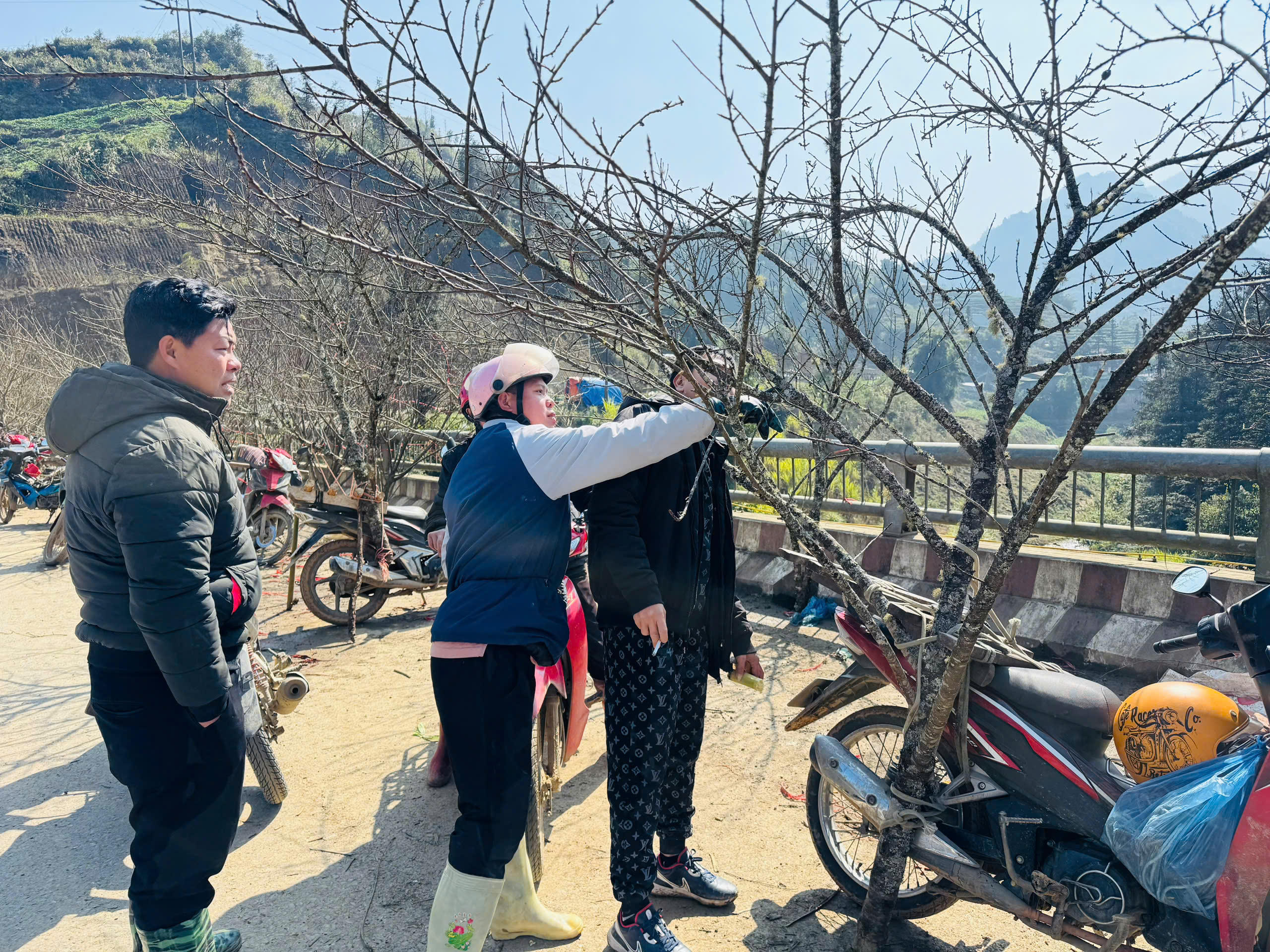 Để thuận lợi cho việc vận chuyển, người dân thường dùng xe máy để chở đào đi bán.