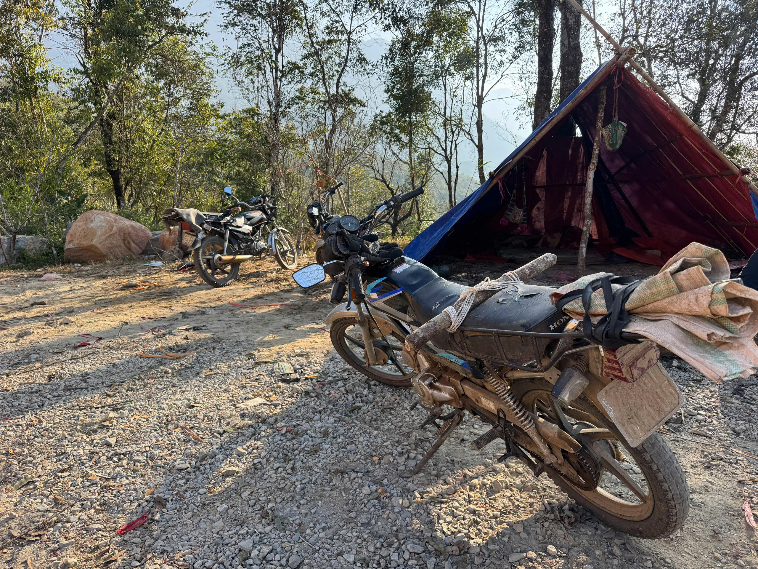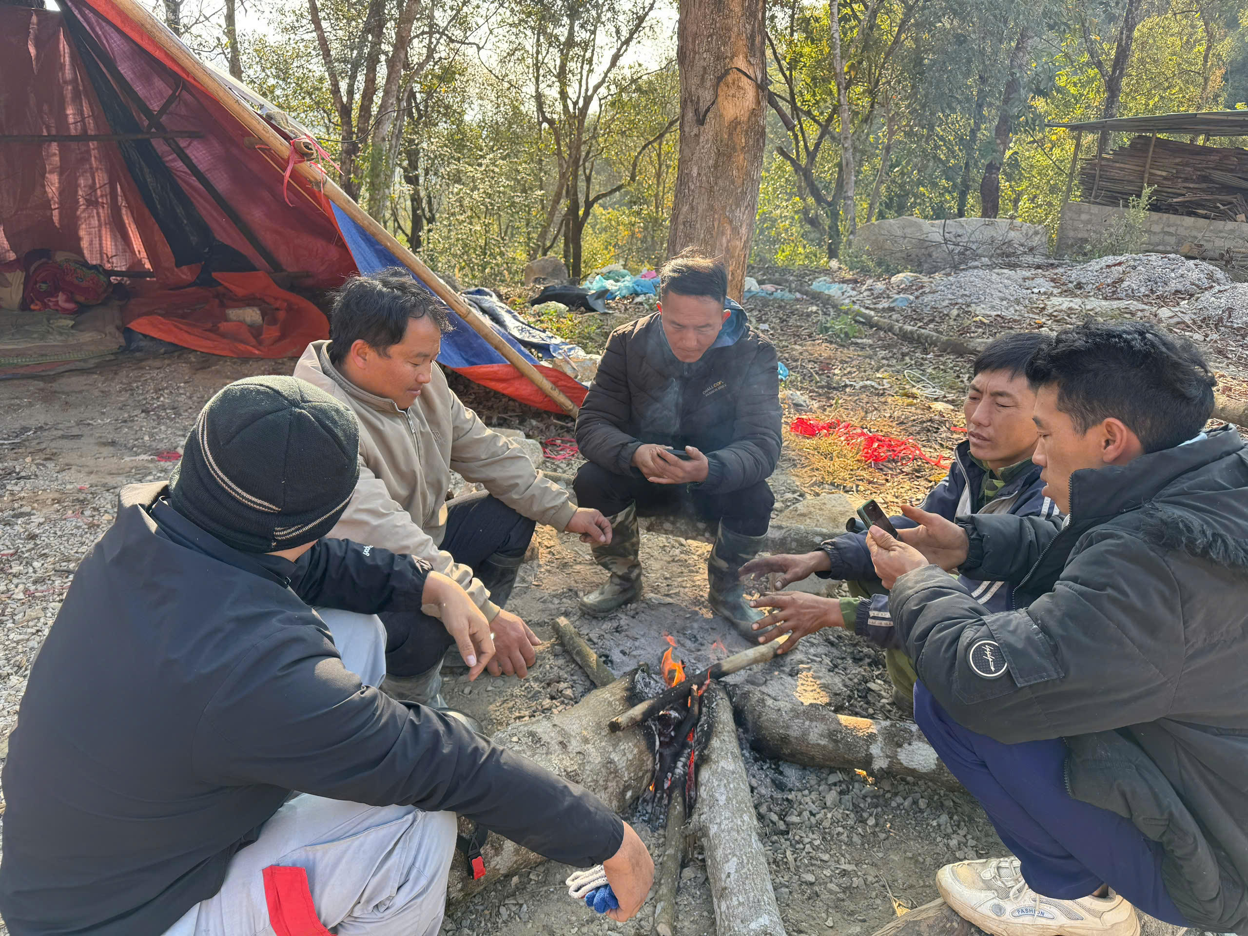 Người dân dựng lều, đốt lửa sưởi ấm để bán đào .