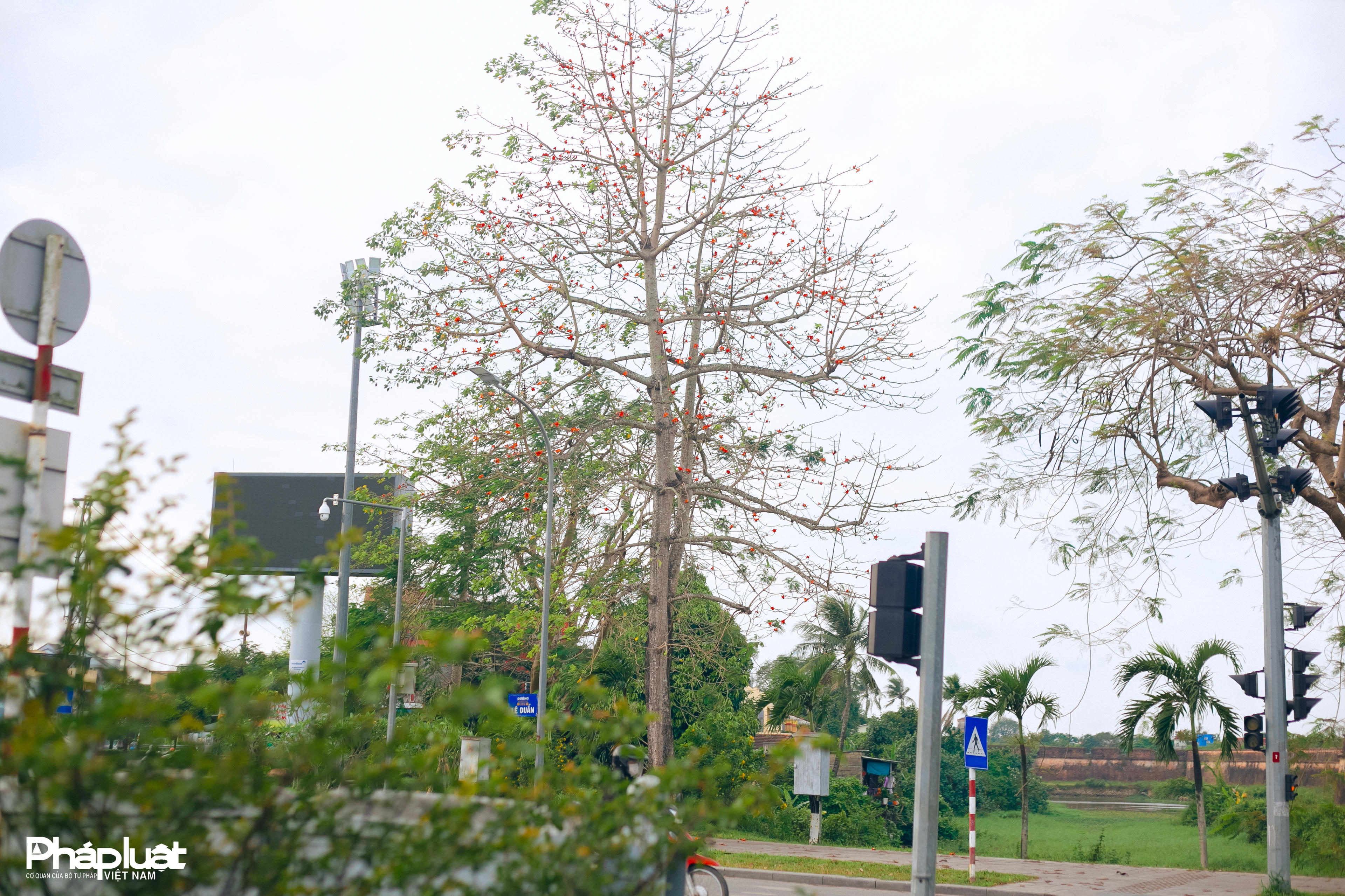 Trên nền trời xanh thẳm cùng nét cổ kính của đền đài, thành quách, hoa gạo đỏ rực tôn lên vẻ đẹp cho Huế mộng mơ.