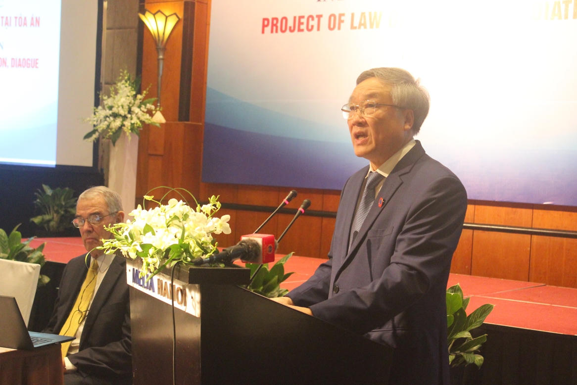 Thực hiện Nghị quyết của Uỷ ban Thường vụ Quốc hội về việc giao TAND tối cao chủ trì xây dựng dự án Luật Hòa giải, đối thoại tại Tòa án, TAND tối cao đã cùng với Ban soạn thảo, Tổ biên tập tiến hành sơ kết kết quả thí điểm tại 16 tỉnh, thành phố; khảo sát, lấy ý kiến đối với các nội dung của dự án luật và xây dựng các tài liệu của dự án Luật. Để tiếp tục hoàn thiện, Chánh án TAND tối cao Nguyễn Hòa Bình mong muốn các chuyên gia, nhà khoa học trong nước và quốc tế, các đại biểu tham dự Hội thảo sẽ tích cực thảo luận, đóng góp ý kiến đối với các nội dung của dự thảo Luật bảo đảm các quy định của dự thảo Luật khả thi, phù hợp, đáp ứng yêu cầu của thực tiễn, đạt được mục tiêu đề ra. Trên cơ sở đó nghiên cứu, tiếp thu để tiếp tục hoàn thiện dự thảo trước khi TAND tối cao trình Quốc hội xem xét, cho ý kiến.