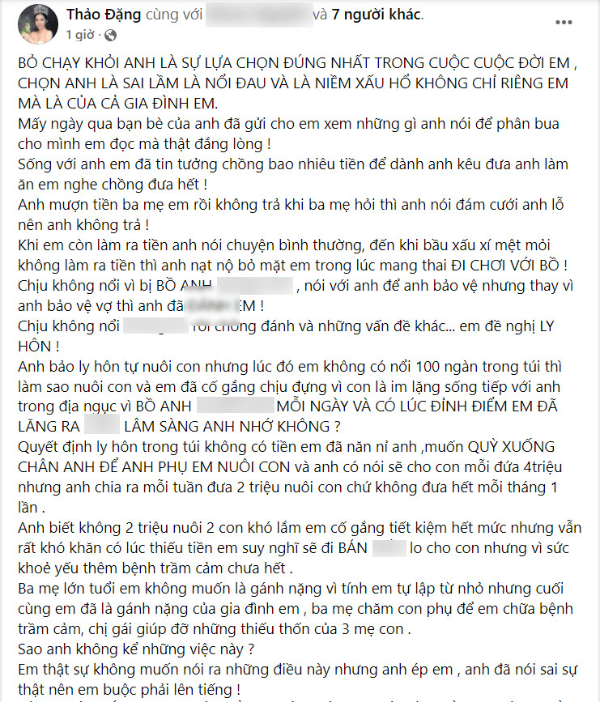 Đặng Thu Thảo cho biết trong những ngày qua, cô đọc những điều mà chồng cũ phân bua và cảm thấy rất đắng lòng. Vì vậy lần này, cô quyết định kể ra thêm 1 loạt tật xấu của anh ta. Cô chia sẻ: "Sống với anh em đã tin tưởng chồng bao nhiêu tiền để dành anh kêu đưa anh làm ăn em nghe chồng đưa hết! Anh mượn tiền ba mẹ em rồi không trả khi ba mẹ hỏi thì anh nói đám cưới anh lỗ nên anh không trả".