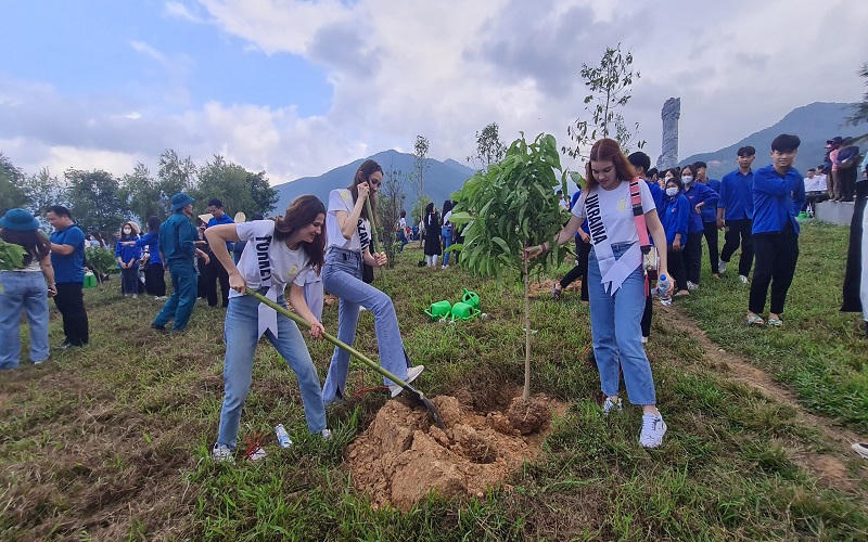 Thí sinh dự thi Hoa Hậu trồng cây tại Trung tâm văn hóa lễ hội Tây Thiên. |