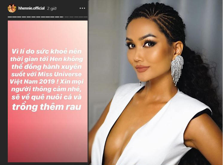 Sau khi đăng tải thông báo về việc không thể đồng hành xuyên suốt cùng Miss Universe – Hoa hậu Hoàn vũ Việt Nam 2019, H’Hen Niê vướng phải tin đồn mâu thuẫn với công ty quản lý về lợi ích và hợp đồng. Trên Instagram Story, cô viết: “Vì lý do sức khỏe nên thời gian tới, Hen không thể đồng hành xuyên suốt với Miss Universe Việt Nam 2019! Xin mọi người thông cảm nhé, sẽ về quê nuôi cá và trồng thêm rau”.