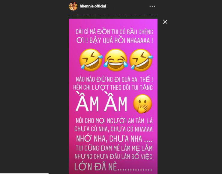 Khi thấy dân tình thi nhau đồn thổi, bàn tán thông tin này, Hoa hậu H’Hen Niê vội vàng giải thích: “Cái gì mà đồn tôi có bầu trời ơi! Bậy quá rồi nha! Nào nào, đừng đi quá xa thế! Hèn chi lượt theo dõi tôi tăng ầm ầm. Nói cho mọi người an tâm là chưa có nha, chưa có nha, nhớ nha, chưa nha… Tôi cũng đam mê làm mẹ lắm nhưng chưa đâu, làm một số việc lớn đã nè”.