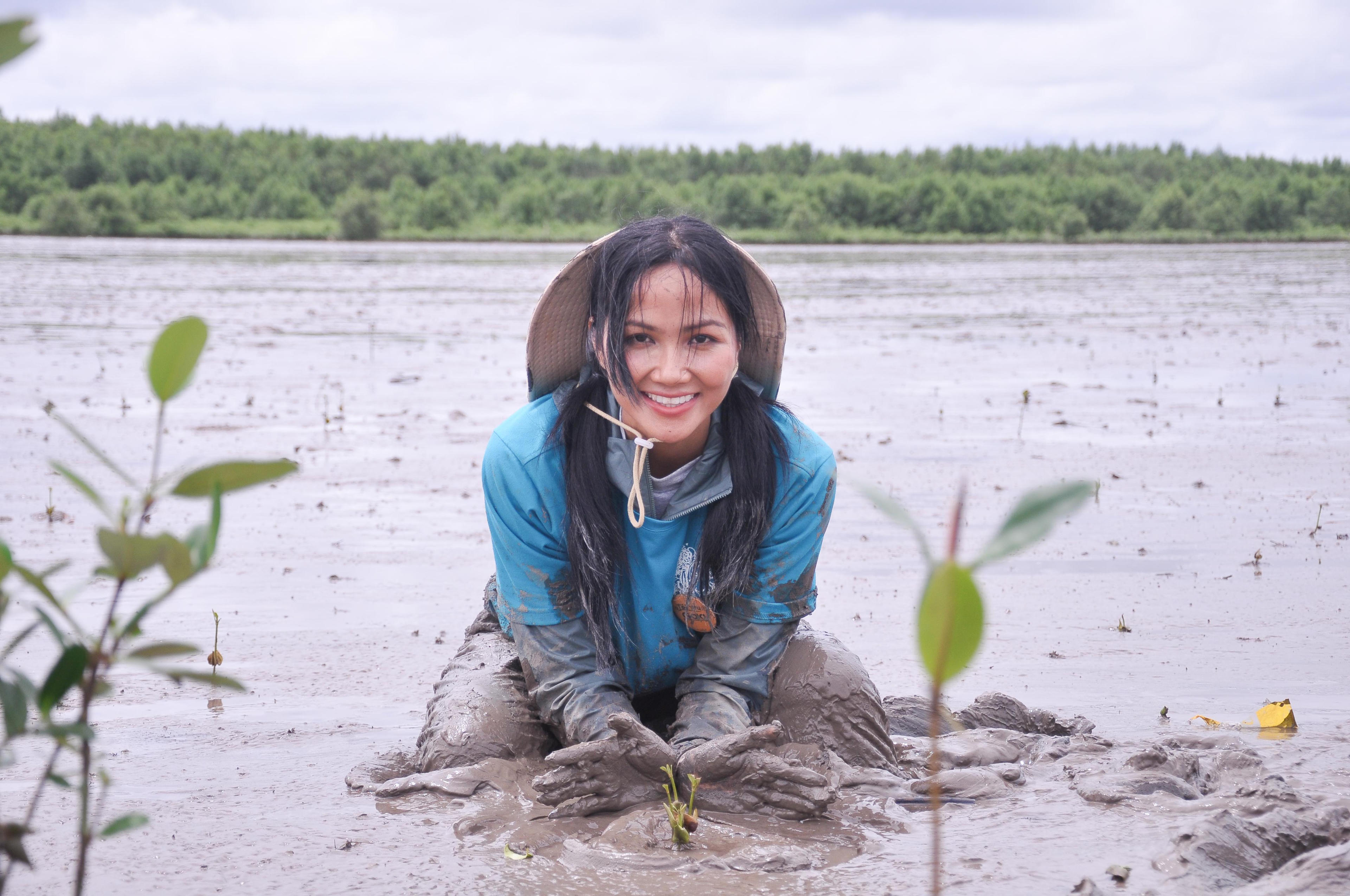 Không quản ngại nắng nóng, Hoa hậu H’Hen Niê cùng các bạn trẻ lội bùn, tham gia gia cố lại các khu hàng rào bị hỏng do tác động của sóng. Vừa làm việc, đếm số cây mắm trắng con tái sinh trên diện tích 50ha rừng Cà Mau được thực hiện khoanh nuôi năm 2020, H’Hen Niê vừa trò chuyện trực tuyến với cư dân mạng nhằm lan tỏa thông điệp bảo vệ rừng và trồng rừng Cà Mau.