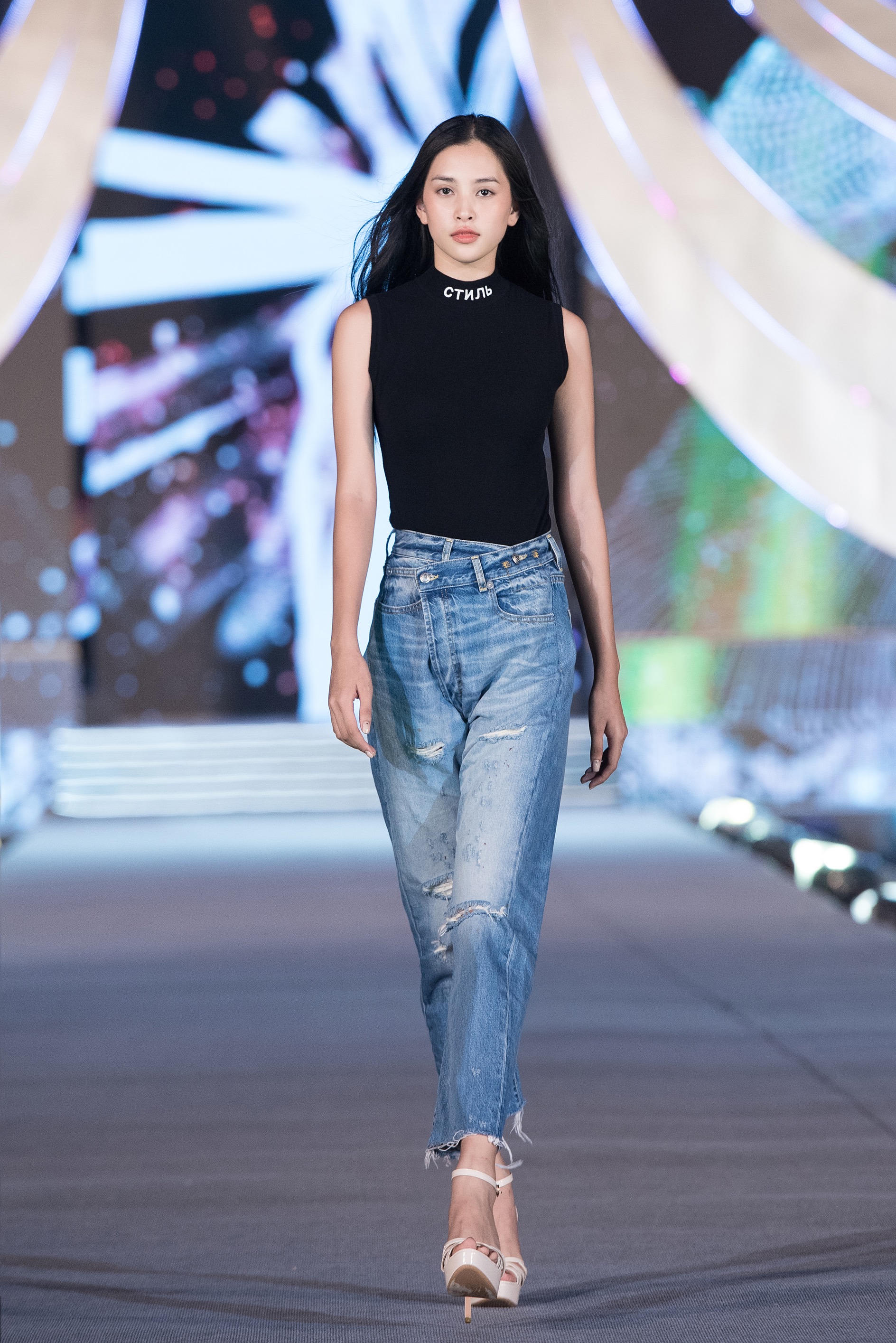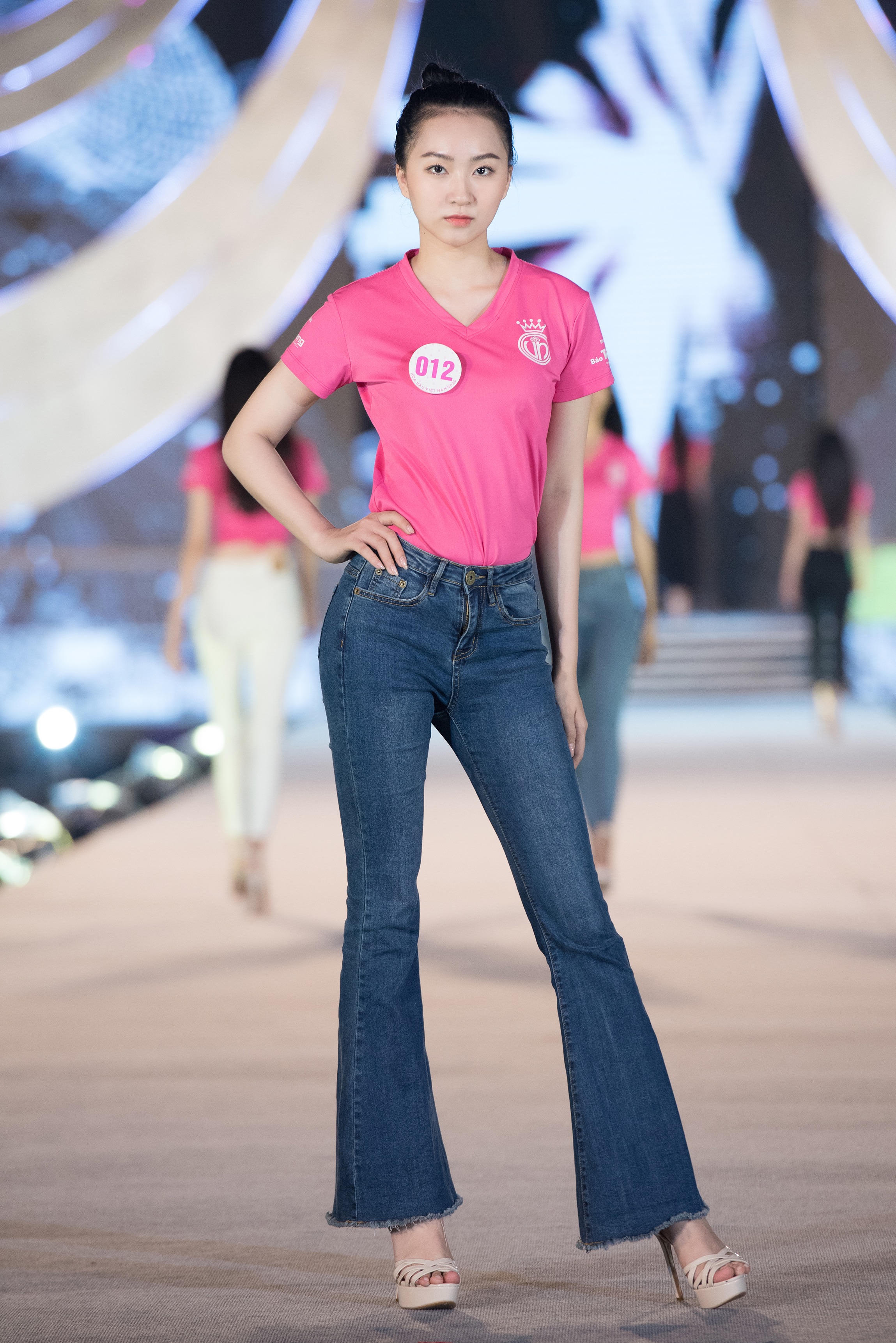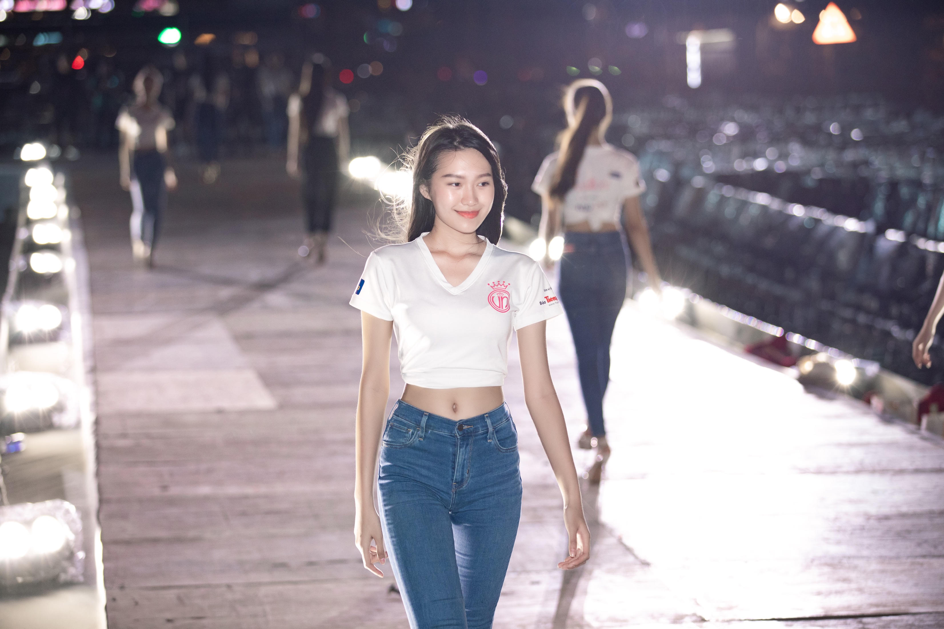 Đa phần các thí sinh đều xuất hiện với hình ảnh giản dị tham gia tổng duyệt. Trên sàn runway trải dài 40m, nhiều cô gái lựa chọn trang phục quần jean ôm sát khoe dáng phối áo thun. Với tâm thế tự tin, tuy diện đơn giản họ vẫn mang khí chất trẻ trung và nhiệt huyết riêng biệt.