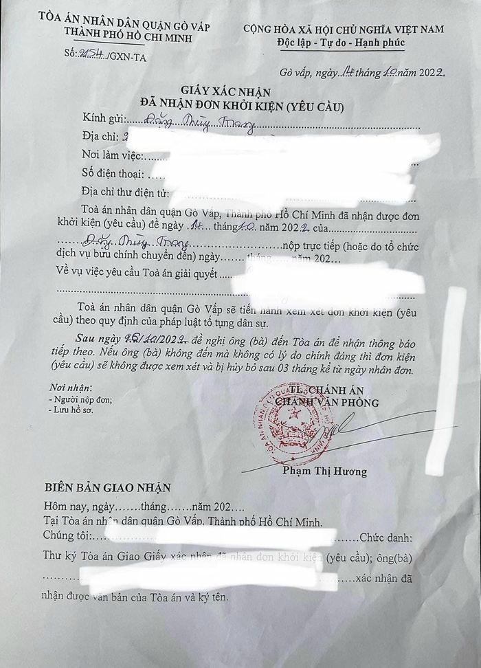 Được biết, phía Tòa án nhân dân quận Gò Vấp cũng có văn bản xác nhận đã nhận đơn khởi kiện của bà Đặng Thùy Trang vào 14/10/2022.