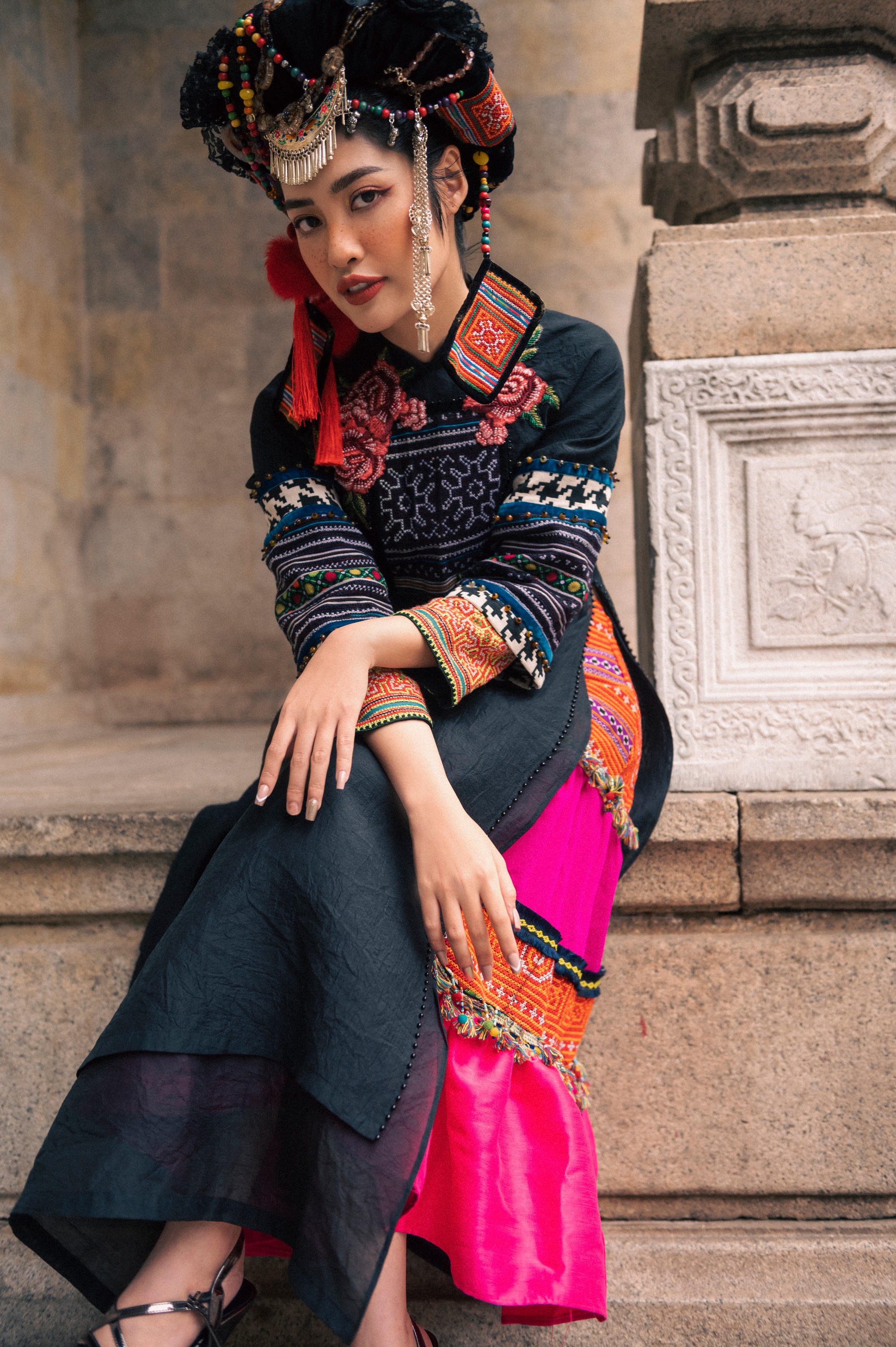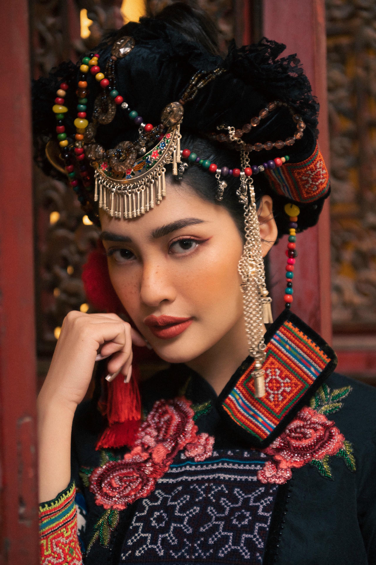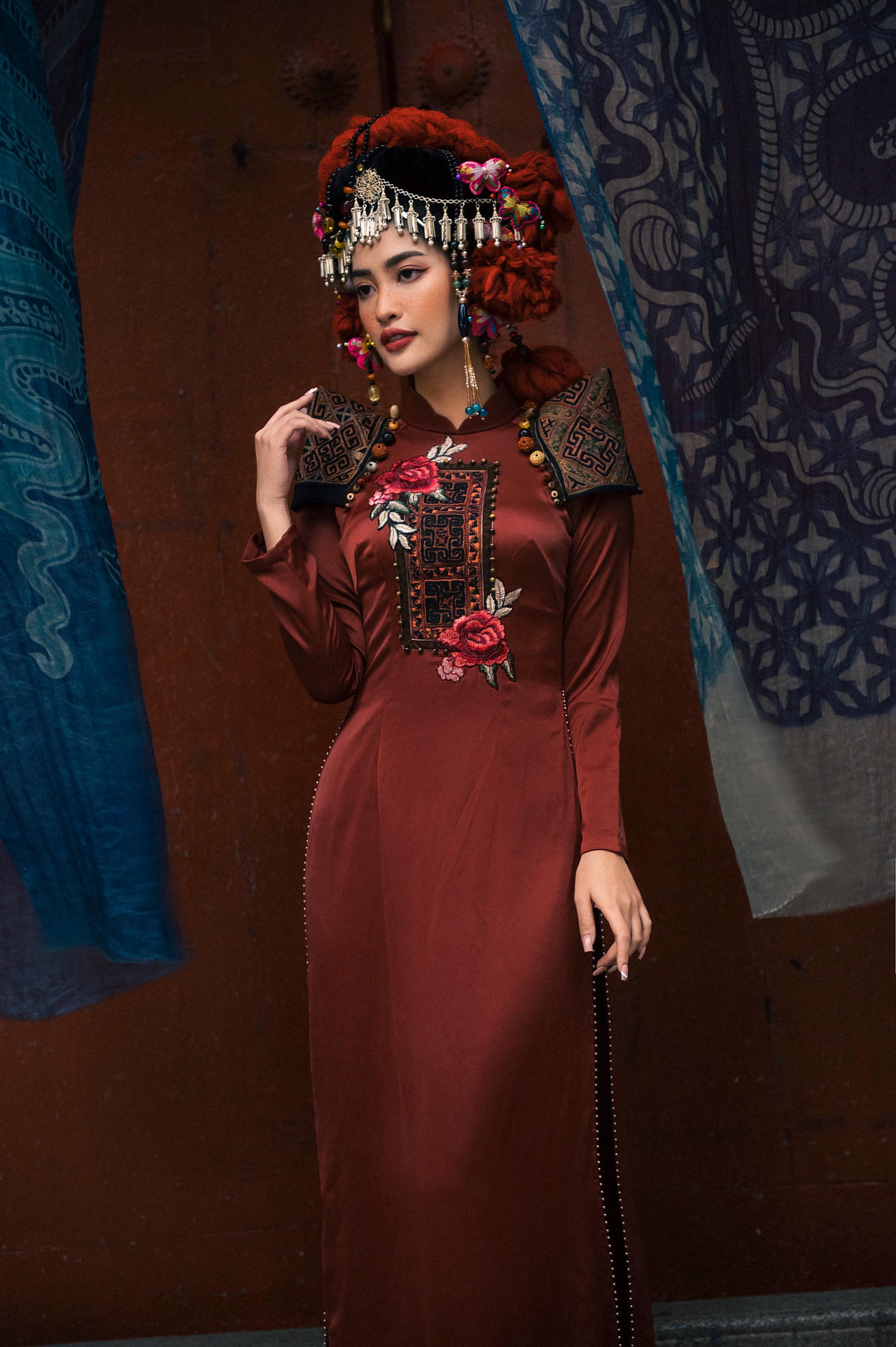 Trong bộ ảnh mới, Hoa hậu các dân tộc Việt Nam 2022 Nông Thúy Hằng khoe nhan sắc trong các thiết kế áo dài thổ cẩm. Kiểu tóc búi cao cùng lối trang điểm đậm, sắc sảo giúp người đẹp khoe được các đường nét thanh tú trên gương mặt. Cô lựa chọn các phụ kiện cài đầu, hoa tai cùng tông màu với trang phục để tạo nên một tổng thể đồng điệu.