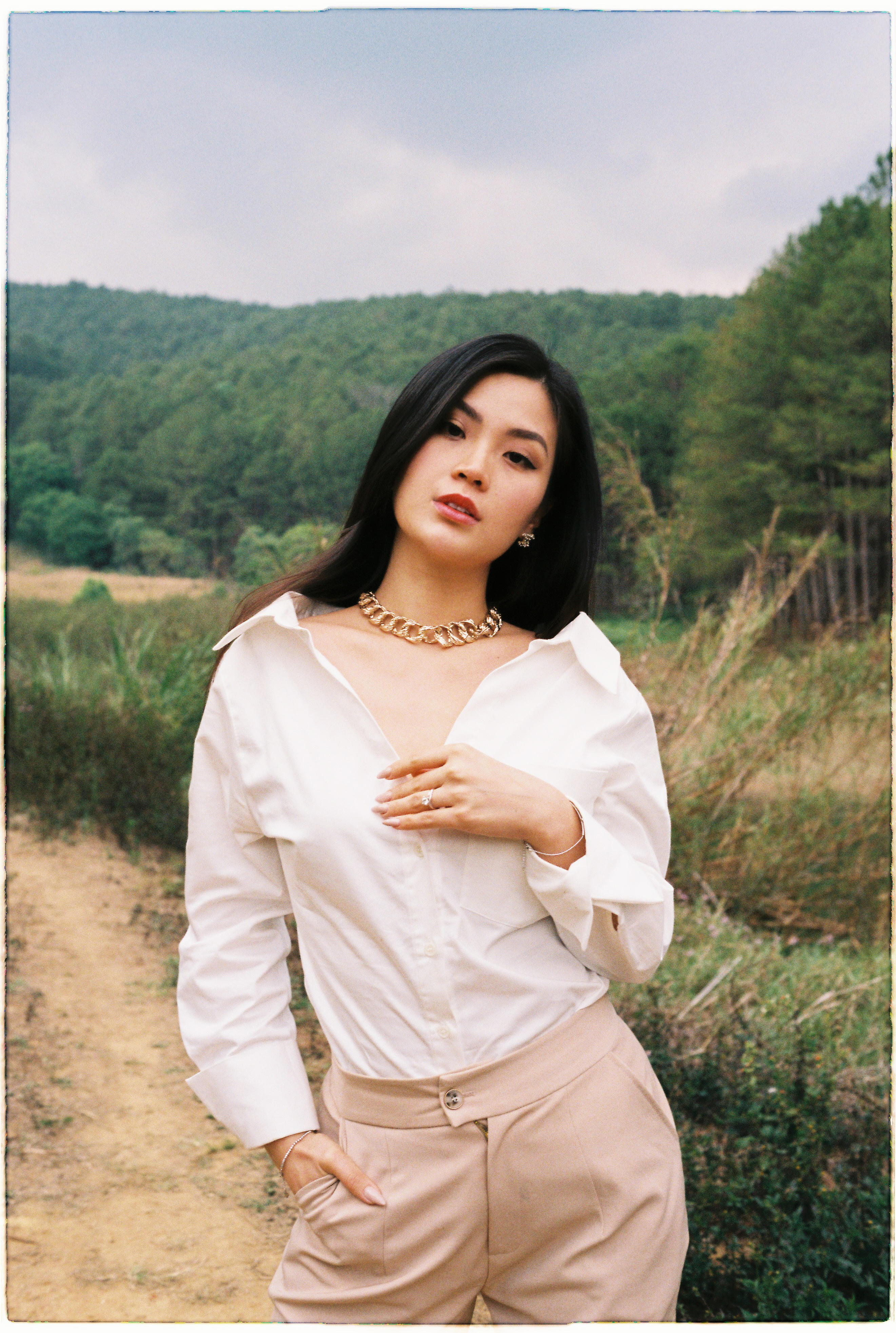 Hoa khôi Thuý Vi dịu dàng cùng tóc dài buông xoã tự nhiên.