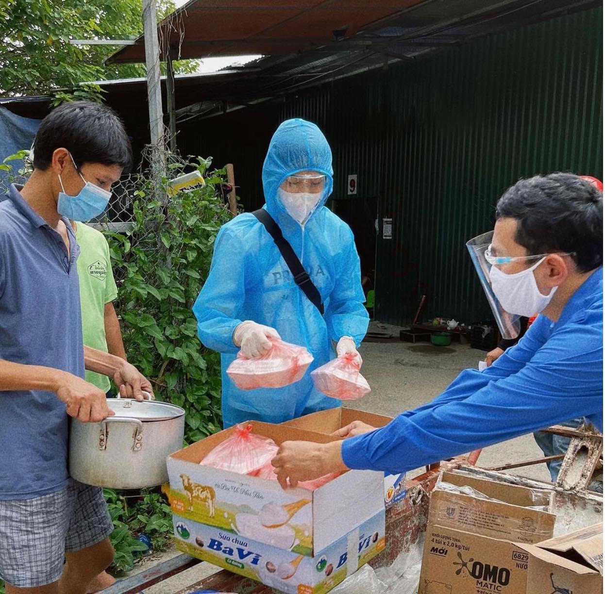 Đỗ Thị Hà mặc đồ bảo hộ đi trao cơm cho người dân. Ảnh: SV. |