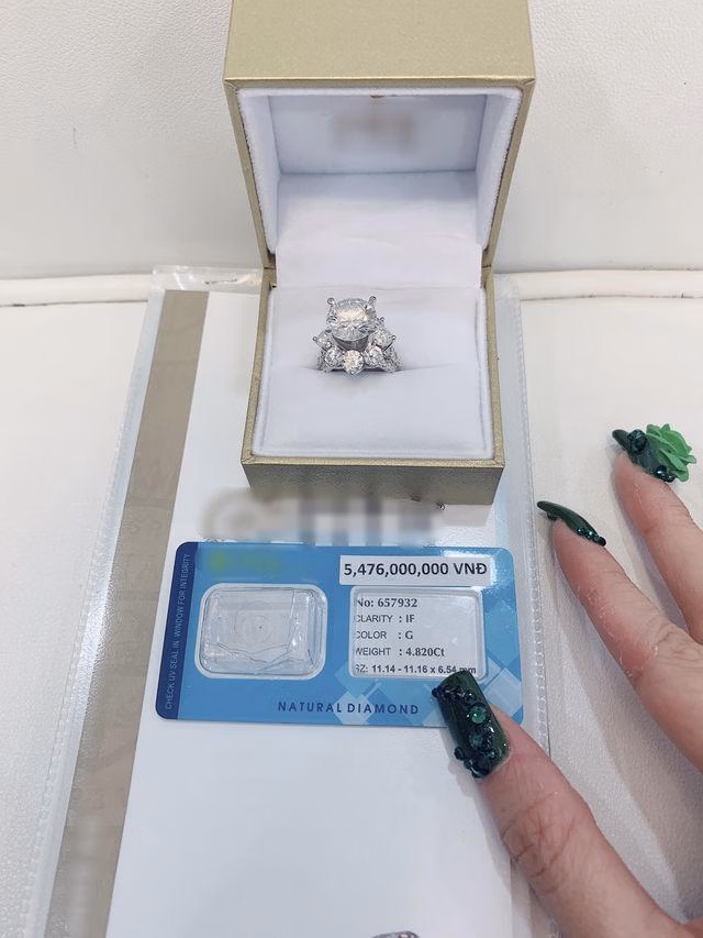 Món quà là một chiếc nhẫn kim cương thiên nhiên cỡ lớn có kèm giấy tờ kiểm định. Theo hóa đơn đi kèm có thể thấy giá trị của nó lên đến hơn 5,4 tỷ đồng được tặng bởi người bạn trai doanh nhân đã có thời gian tìm hiểu hai năm của cô.