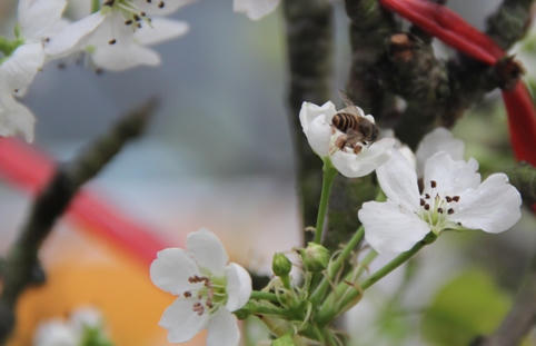 Hàng trăm cành hoa lê trắng muốt được người bán dựng dọc hai bên bờ đê chợ hoa Quảng Bá thu hút mọi ánh nhìn. Nhiều người nhìn qua tưởng hoa mai trắng hoặc hoa mận nhưng tới gần mới thấy hoa lê có vẻ đẹp rất khác lạ. Cánh hoa trắng ngần, mỏng manh mọc thành từng chùm, xen với những lộc non mới nhú.