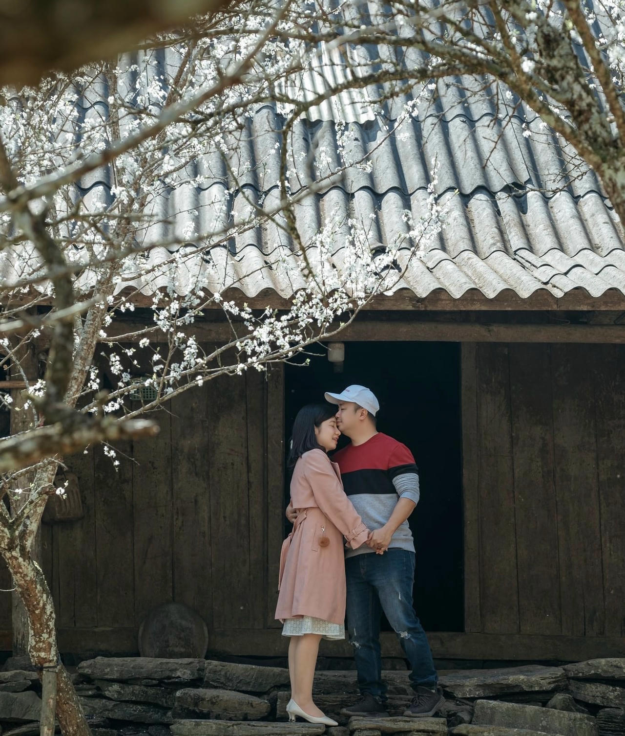 Những ngôi nhà trình tường truyền thống nhỏ xinh bên triền núi lấp ló dưới bóng những vườn mận trắng tạo nên khung cảnh thật thơ mộng và lãng mạn