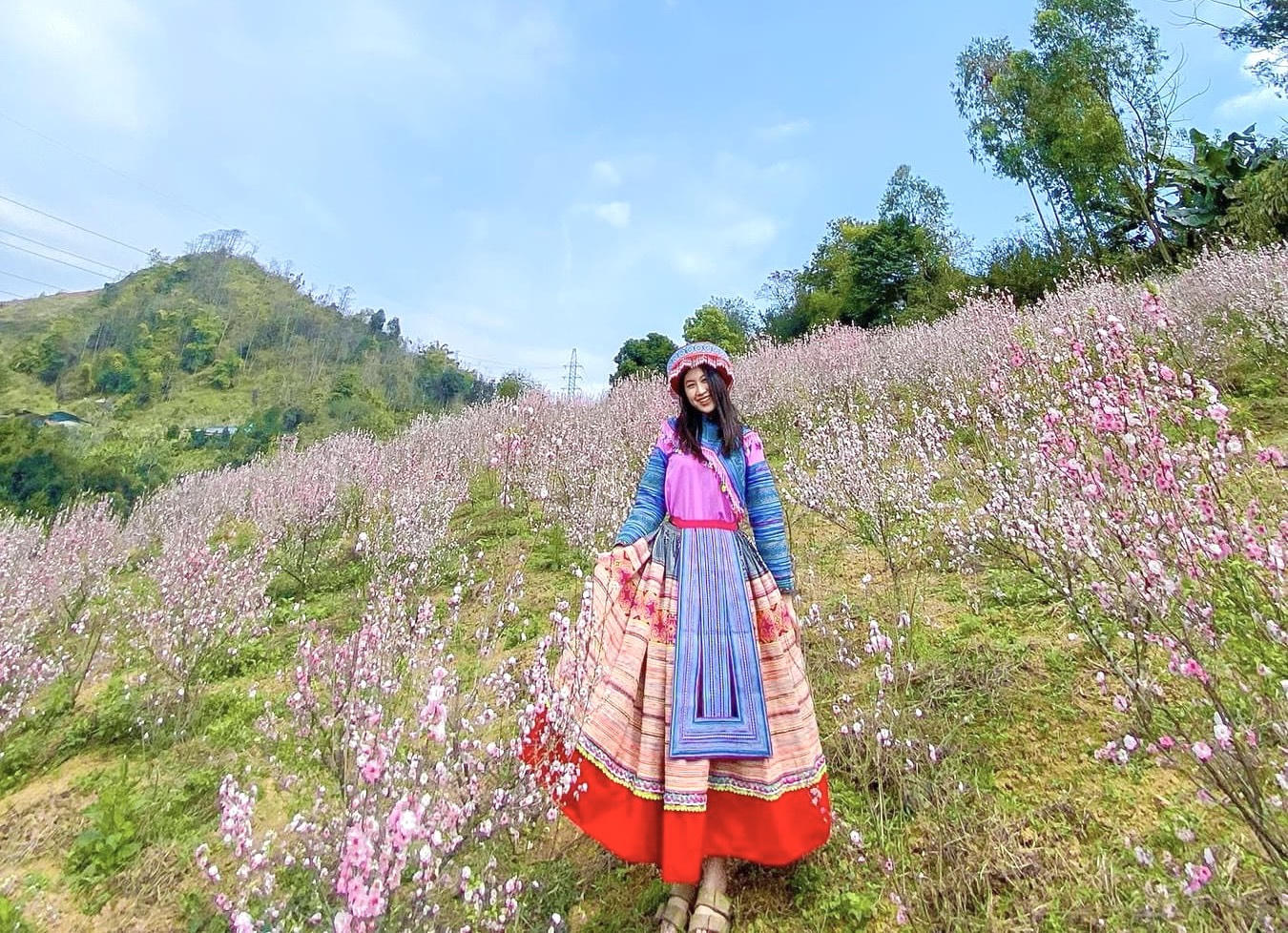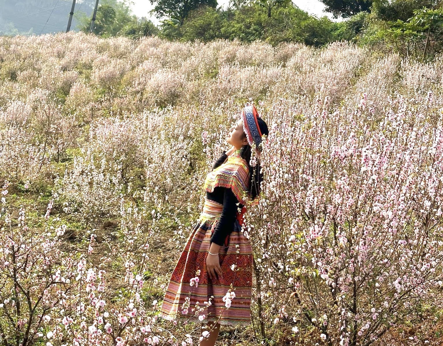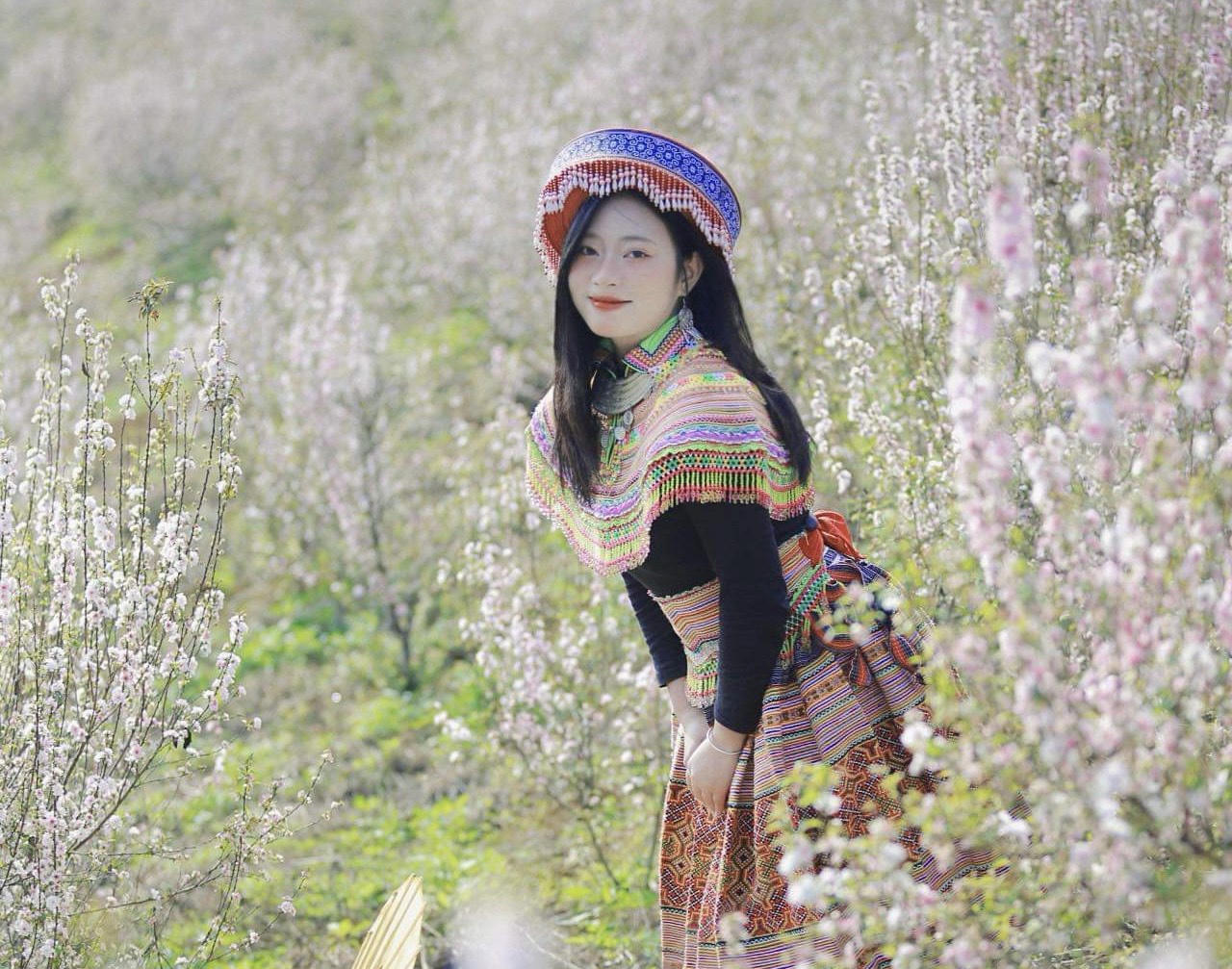 Cô gái trong trang phục dân tộc Mông thêm dịu dàng, quyến rũ khi đứng giữa vườn Nhất chi mai bạt ngàn một màu trắng tinh khiết.