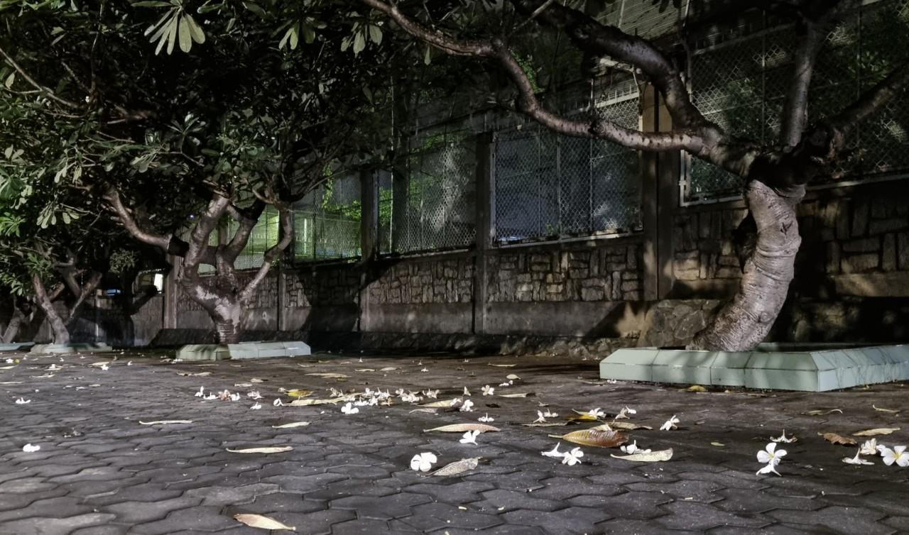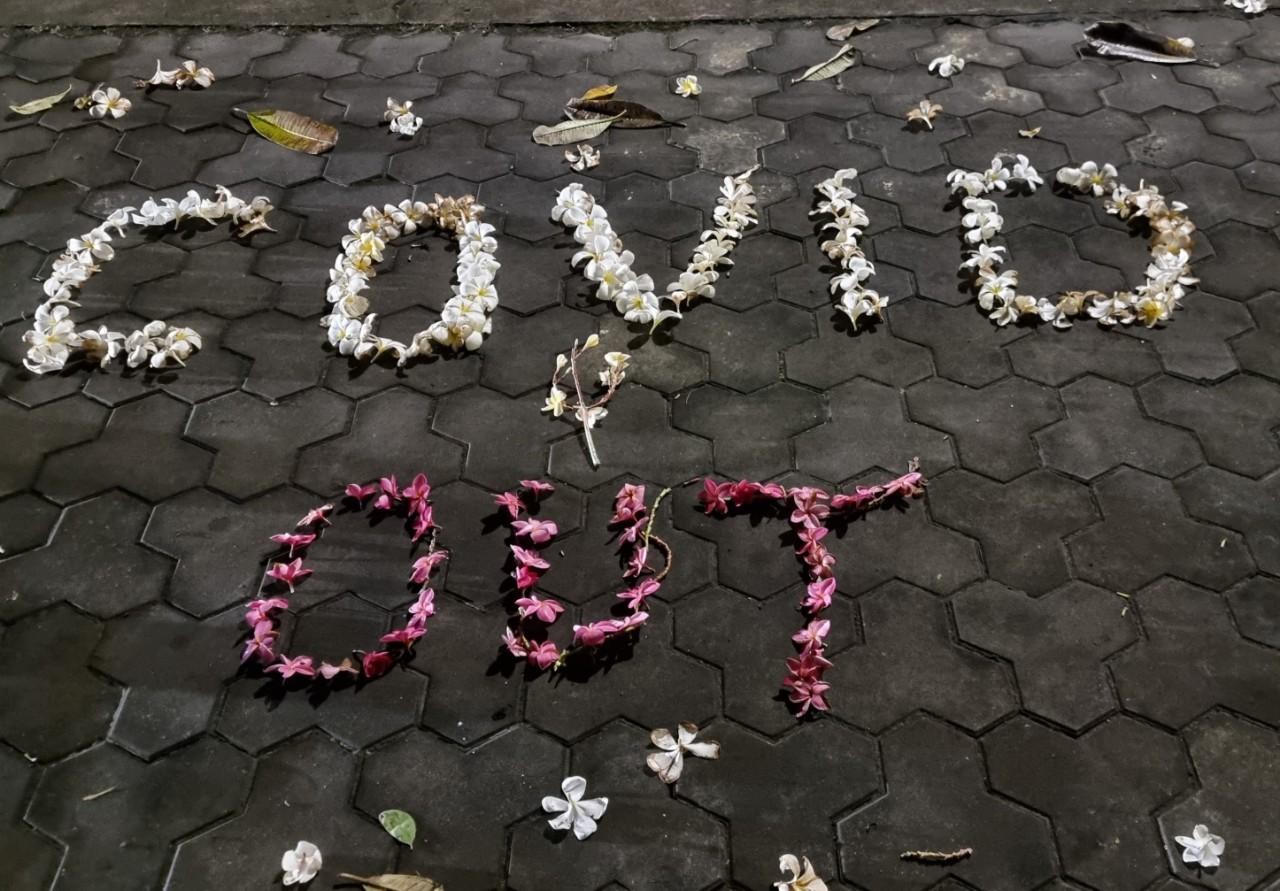 (PLVN) - Vô tình ngang qua Khu Công nghiệp Biên Hòa 2 (Đồng Nai) trong một buổi tối còn vương những giọt nước sau cơn mưa rào, chúng tôi không thể rời mắt bởi dòng chữ “COVID – OUT” mà ai đó đã dùng những bông hoa sứ ghép lại trên vỉa hè. Xa hơn, những hàng Sứ vẫn lặng lẽ đơm hoa như chờ đón trạng thái bình thường mới sẽ trở lại cùng với tiếng cười rộn rã của những người công nhân.