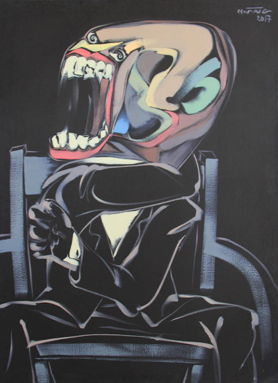 Và thế là, thế giới hội họa của Nguyễn Xuân Hoàng đã mở ra những tiếng gào thét đầy bất ổn, những diện mạo người phẫn nộ cuồng điên, những cuộc chiến giữa nhiều người và trong chỉ một người, những tiếng vang buốt óc và cả những thinh lặng tột cùng. Serie tranh “Những nhân dạng nhiều mặt” ra đời cách đây khoảng hơn 1 năm đã bắt đầu cho ý tưởng ấy. Đó là những gương mặt người không rõ đang hoảng hốt, gào rú hay nộ cuồng tê dại, chỉ biết rằng chúng như đang bị bóc tách từng lớp mặt để thấy rõ một tổng thể đa dạng phía bên trong. Những chuyển động của cơ mặt, những màu sắc nhập nhằng xen lẫn trên từng nhân diện đã tạo ra thứ âm thanh như tiếng gào thét trong tranh Hoàng. Tiếng thét chói tai, nhưng đôi khi có cảm giác những thanh âm dữ dội ấy ngưng bặt để chỉ còn lại những khẩu hình. Nín thinh, nhưng lại gầm gào bùng xé hơn bao giờ hết.