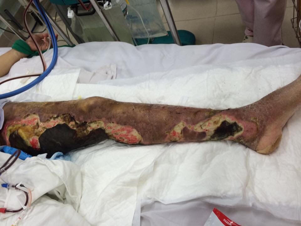 Đây là trường hợp hoại tử chân trái sau viêm mô tế bào trên nền hội chứng Cushing do thuốc/ viêm khớp dạng thấp ở một bệnh nhân nữ 42 tuổi vào khoa khoảng 3 tuần trước. Điều đáng nói là sau khi đi khám chuyên khoa Nhiễm với chẩn đoán viêm mô tế bào/viêm khớp dạng thấp, bệnh nhân về nhà tìm hiểu trên báo mạng và tự ý thay đổi liều corticoid và kháng sinh bác sĩ đã kê, kết hợp đắp thêm nhiều loại lá quý hái trên rừng. Và kết quả là phải quay vào bệnh viện.