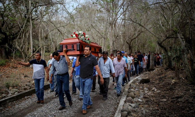 | Cảnh sát mang quan tài chứa thi thể của Pedro Huesca, điều tra viên mất tích năm 2013, rời hiện trường khu mộ tập thể được phát hiện tại bang Veracruz hồi đầu tháng 9/2018 |