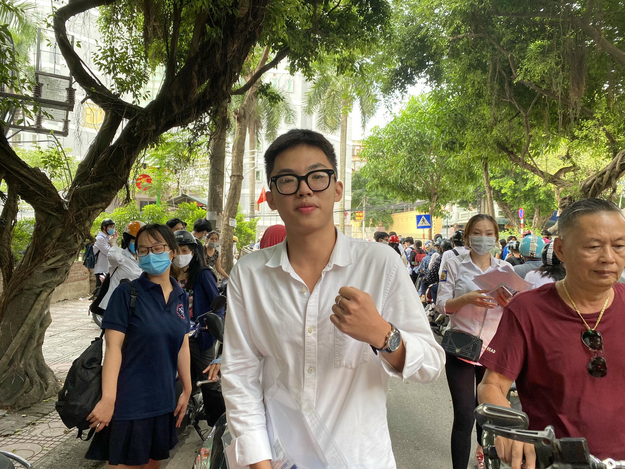 Giống như Kiên, thí sinh Nguyễn Phương Hiền, học sinh trường THPT Thực nghiệm cũng đánh giá đề thi Toán không quá khó: "Có lẽ do kỳ thi diễn ra khi đang có dịch Covid-19 vì vậy đề không quá khó, nhưng về mặt bằng chung thì đề có sự phân hóa thí sinh vì phía cuối có những câu khó hơn. Đợt nghỉ dịch em cũng ôn luyện rất nhiều nên đến khi thi em không cảm thấy áp lực lắm. Về công tác phòng dịch tại điểm thi em thấy các anh, chị tình nguyện viên, thầy cô giáo và các cô y, bác sĩ thực hiện rất tốt nên cũng không thấy lo lắng gì cả. Bài thi hôm nay em tự tin mình đạt 8 điểm".