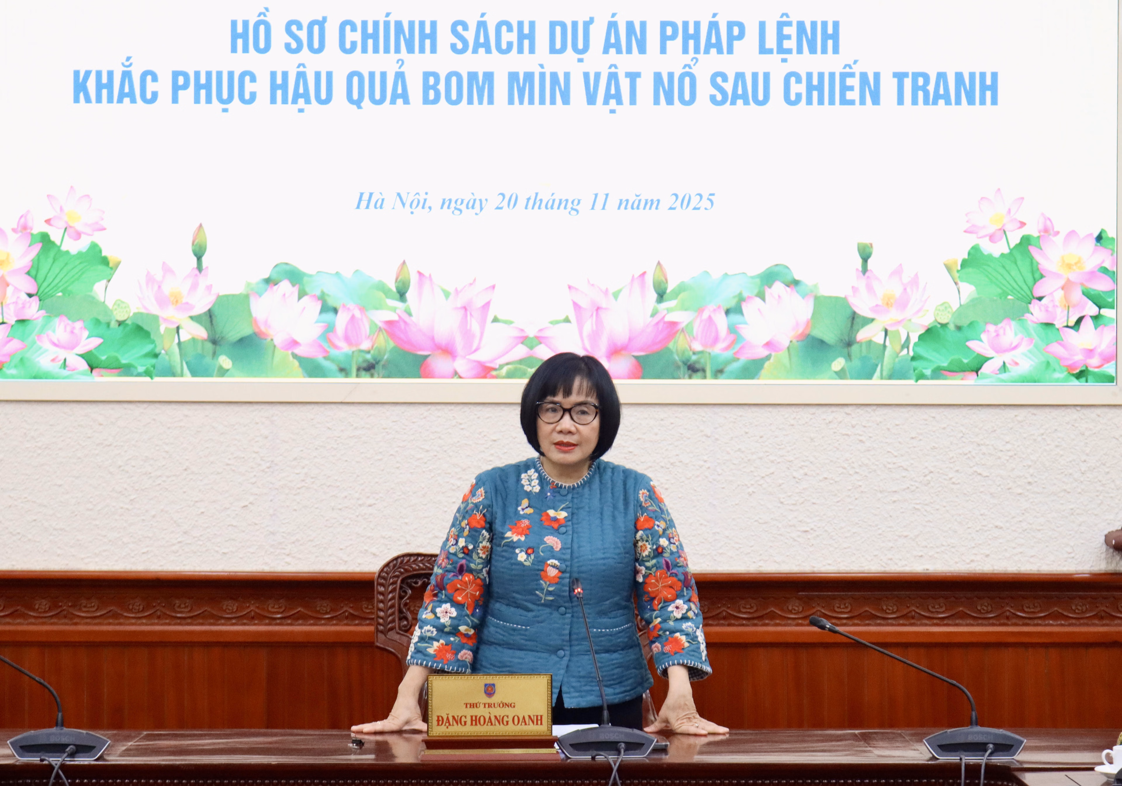 Phát biểu kết luận, Thứ trưởng Đặng Hoàng Oanh đề nghị cơ quan soạn thảo tiếp tục rà soát, lược bỏ các nội dung chưa phù hợp với phạm vi của Pháp lệnh; đồng thời nghiên cứu đề xuất xây dựng thành Luật Khắc phục hậu quả bom mìn sau chiến tranh để xử lý triệt để các vấn đề đặt ra.